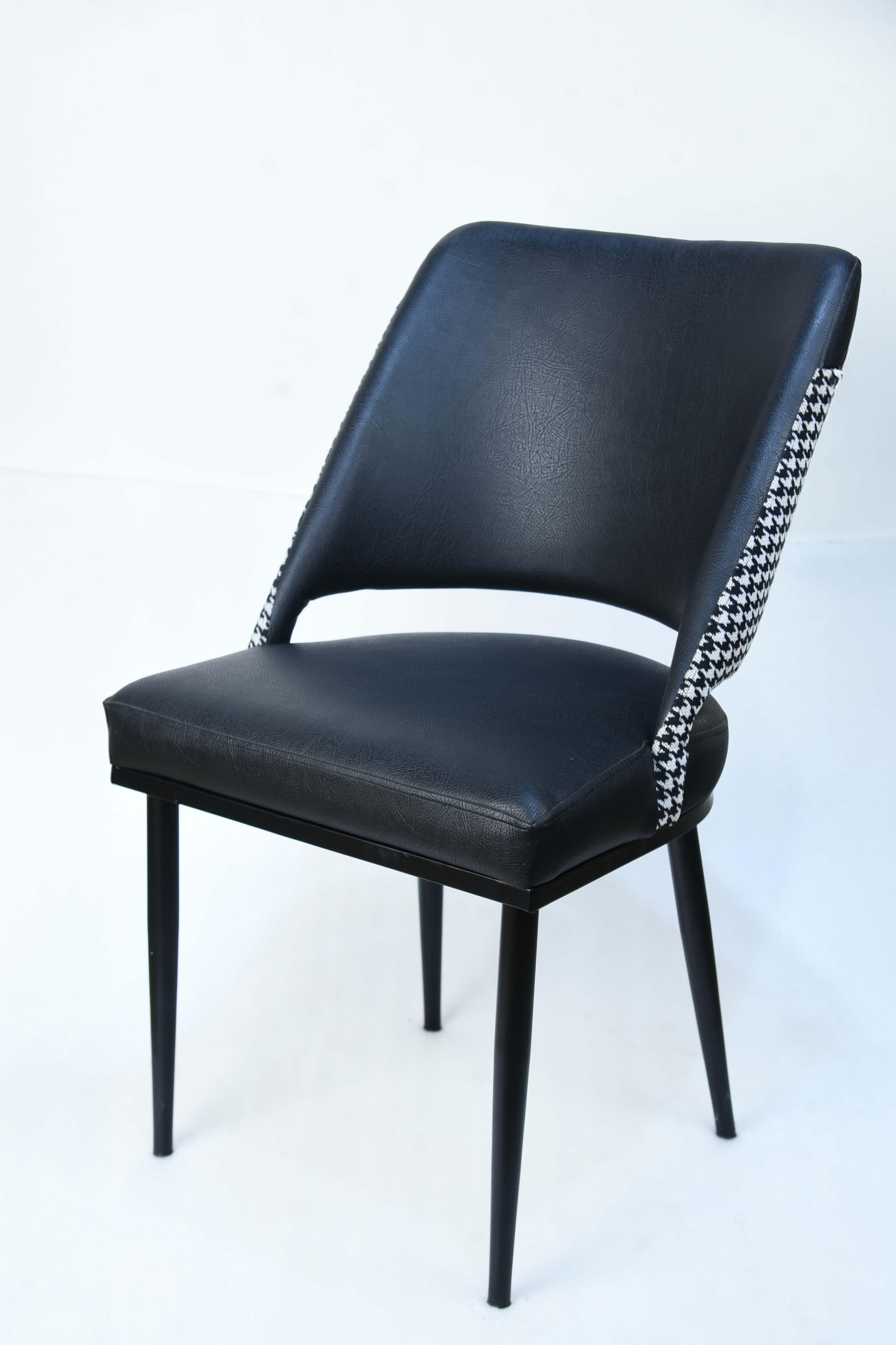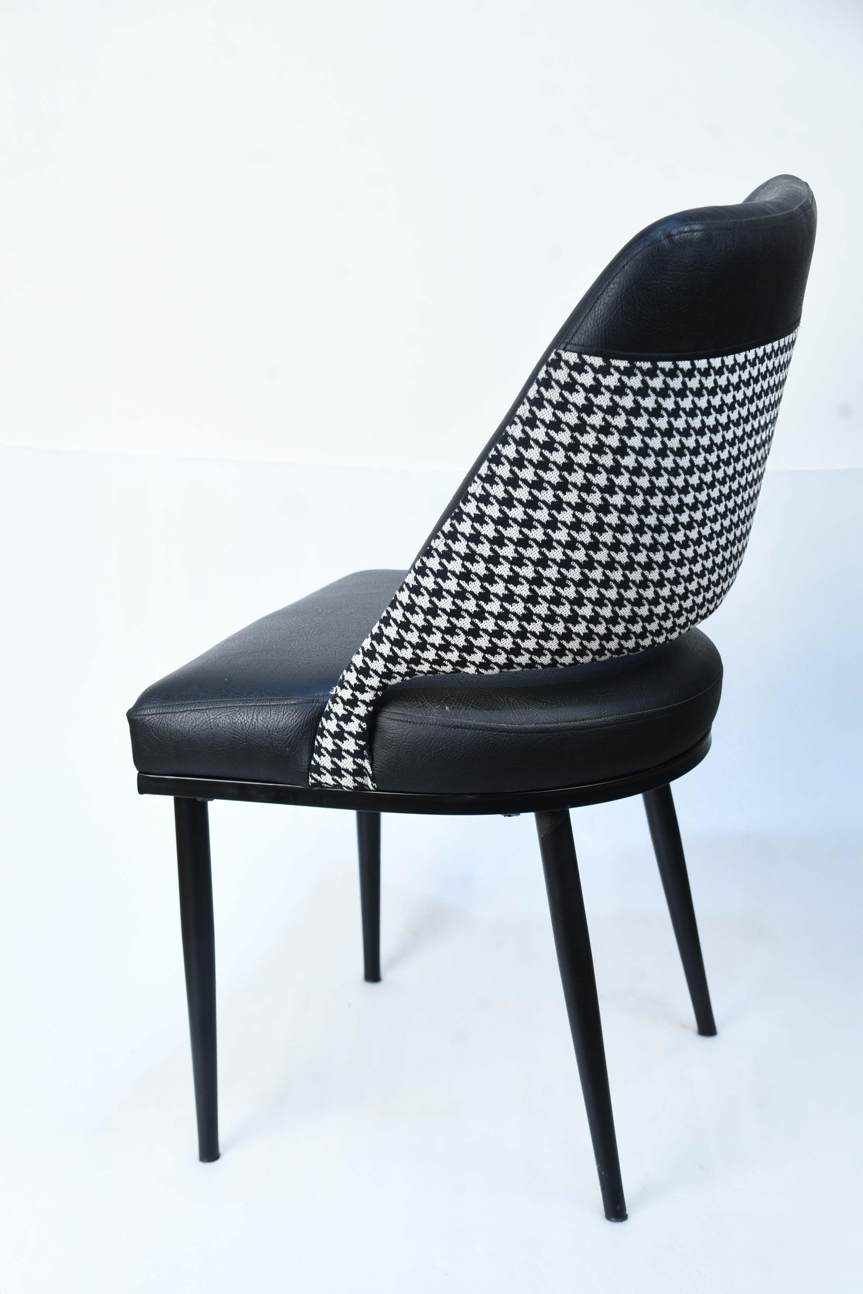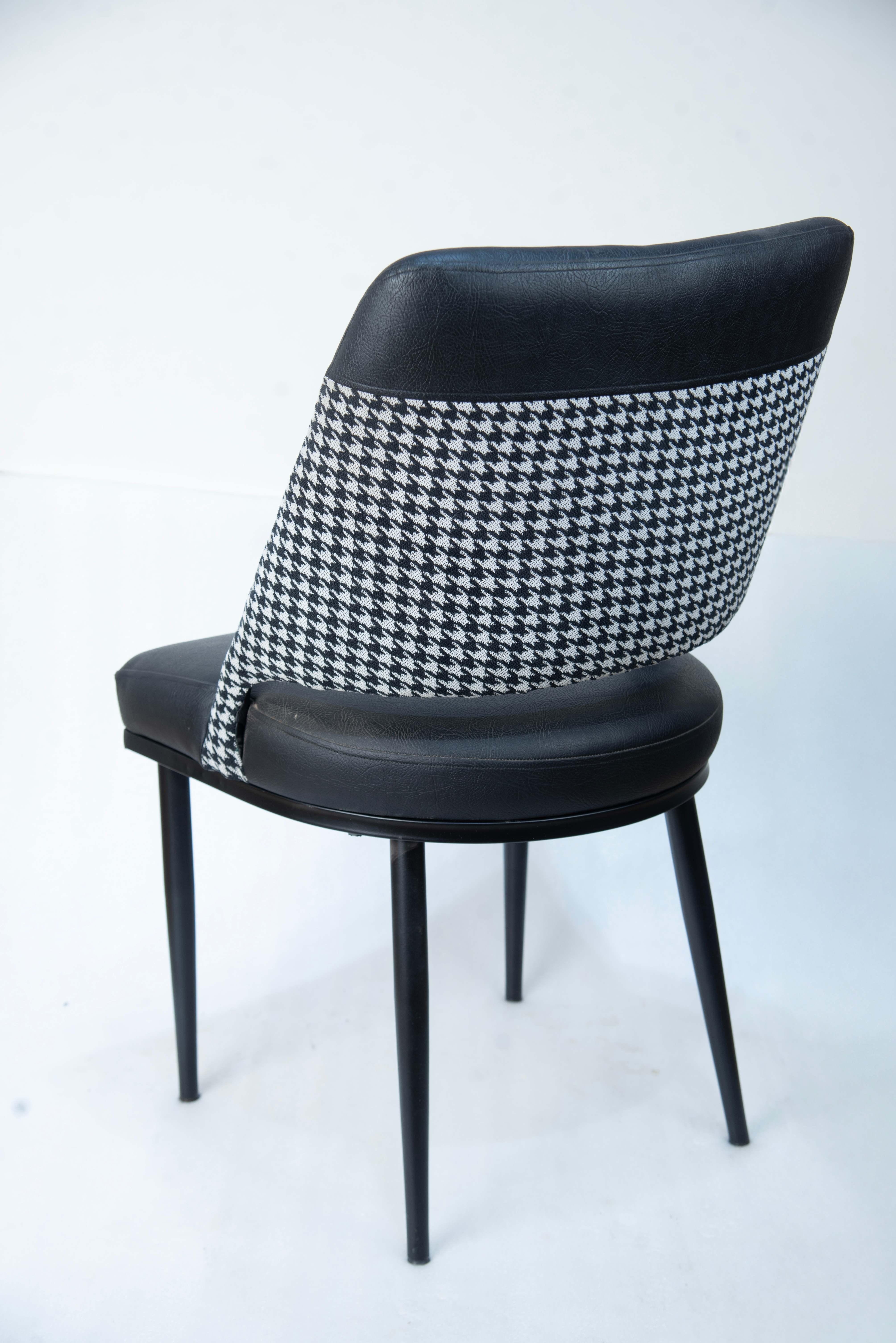 كرسي طعام بتصميم عصري يبرز بجماله وتفاصيله المبتكرة. يتميز بمسند ظهر ومقعد مبطنين بالجلد الصناعي الأسود الأنيق، مع لمسات جانبية من قماش بنقشة الـ "Houndstooth" (قدم الغراب) الشهيرة بالأبيض والأسود، مما يضفي عليه طابعًا مميزًا وجذابًا. الأرجل المعدنية السوداء الرفيعة تكمل المظهر الأنيق وتضمن الثبات والمتانة.