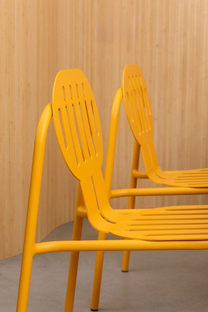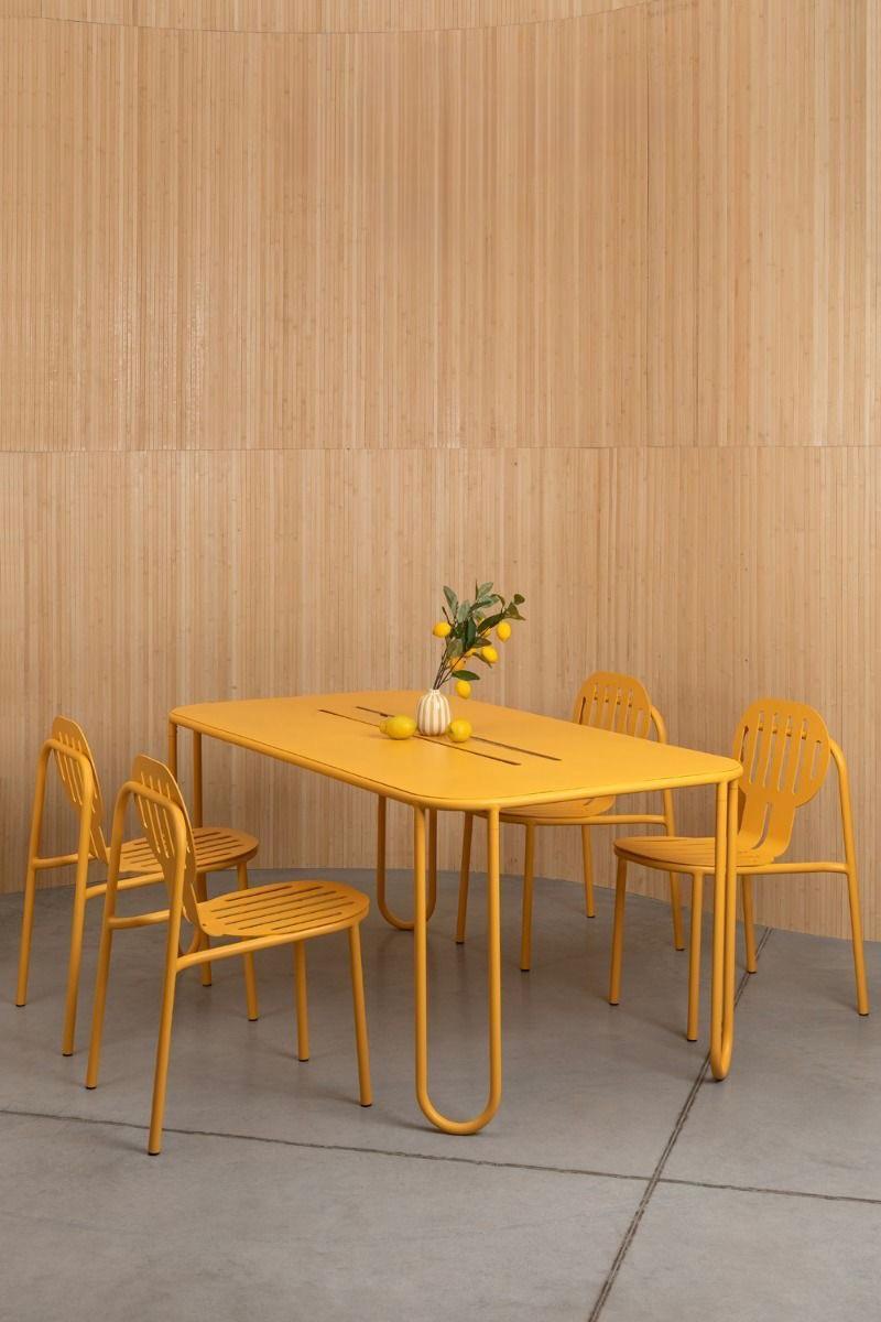 تتميز الطاولة بأرجل فريدة على شكل حرف U مقلوب، مع فتحات عمودية في سطحها. الكراسي بسيطة التصميم، مع ظهور ومقاعد معدنية مضلعة، مما يمنحها مظهرًا عمليًا وخفيفًا. توجد مزهرية بيضاء صغيرة تحتوي على أغصان ليمون على الطاولة، مما يضفي لمسة طبيعية على المجموعة. الخلفية عبارة عن جدار خشبي عمودي وأرضية خرسانية بسيطة، مما يُبرز جمال اللون الأصفر. المواد: