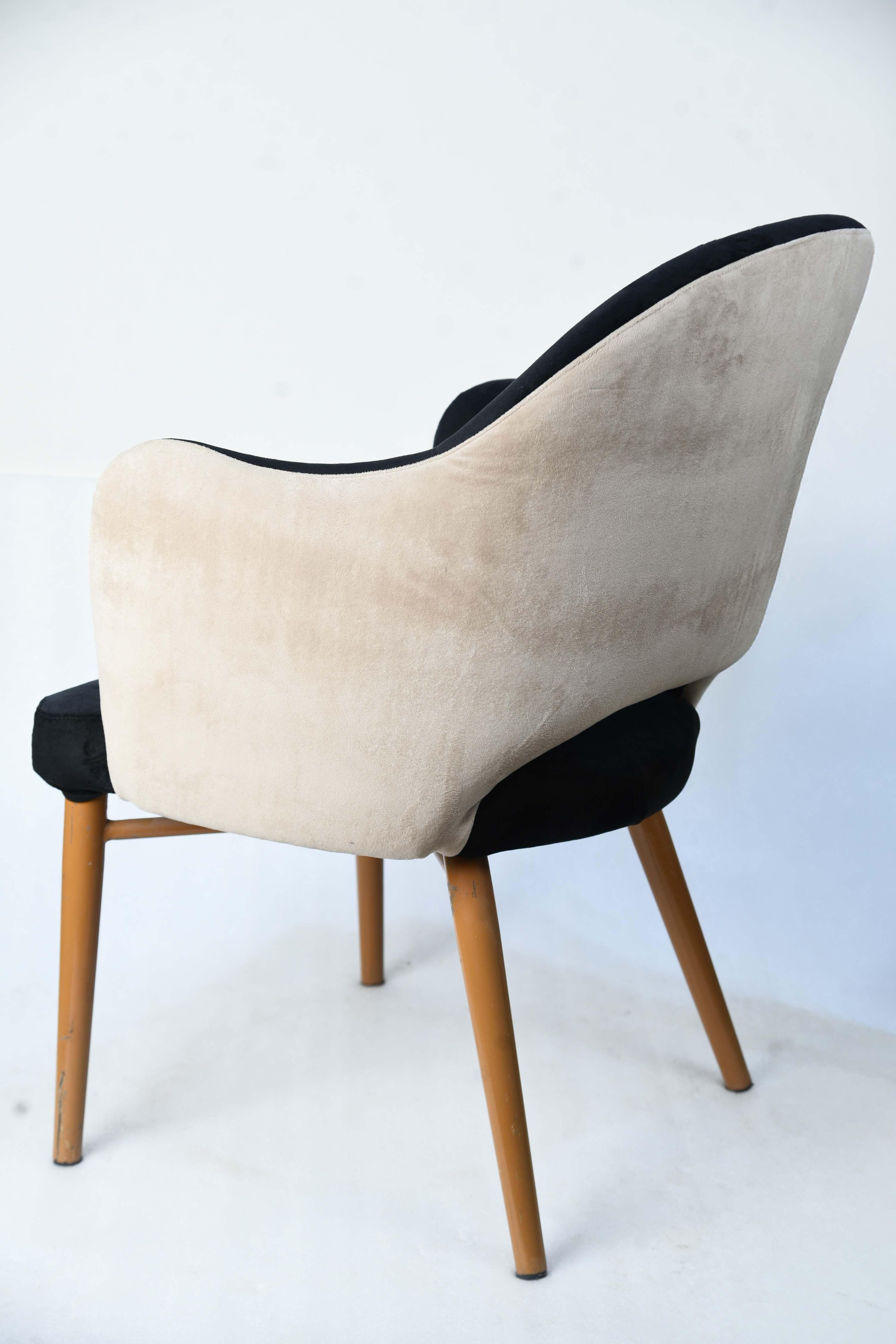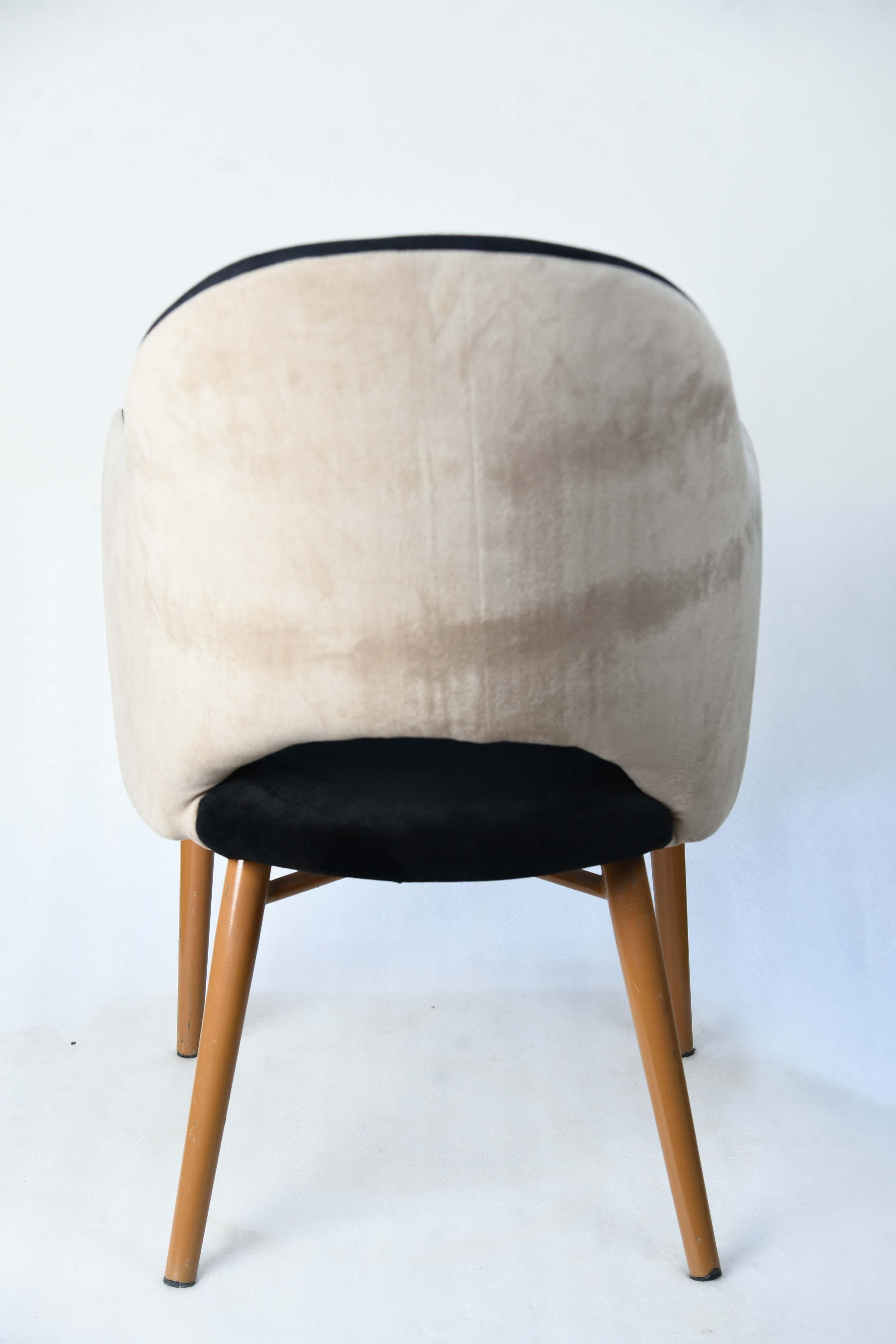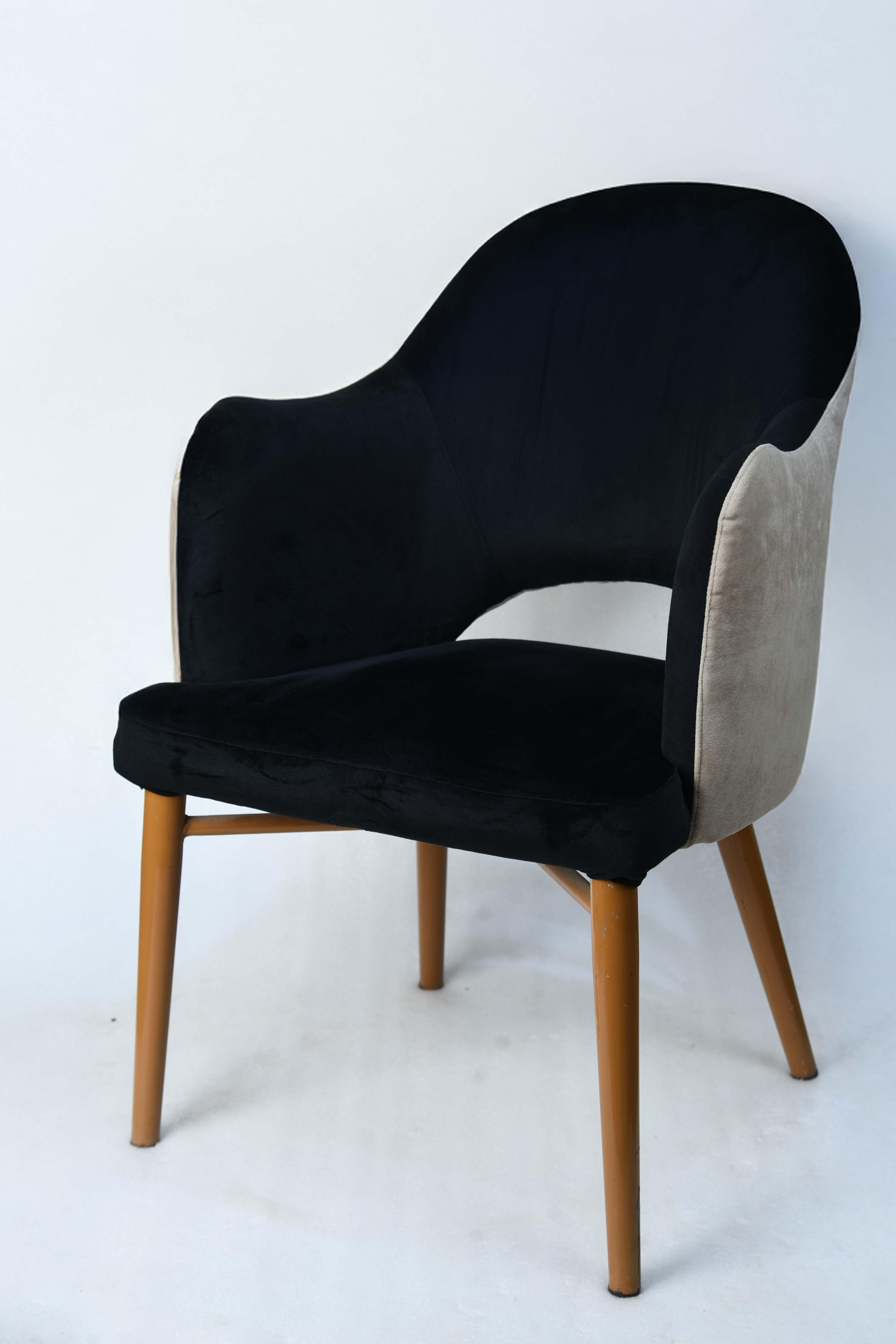 يُعد كرسي "فيلفيت" قطعة فنية تضفي لمسة من الرقي والفخامة على أي مساحة. يتميز بتصميمه الانسيابي الذي يحتضن الجسم، مع مسند ظهر وذراعين مدمجين يمنحان راحة فائقة. الجزء الأمامي للكرسي مغطى بالكامل بقماش مخملي فاخر باللون الأسود العميق، بينما يأتي الجزء الخلفي باللون البيج الهادئ، مما يخلق تباينًا لونيًا جذابًا وفريدًا. يرتكز الكرسي على أرجل خشبية صلبة ورفيعة، تضفي عليه طابعًا عصريًا وخفيفًا.