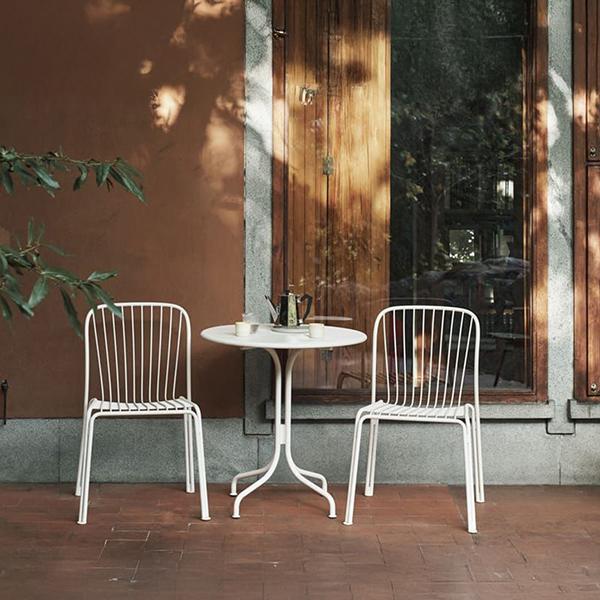 This contemporary outdoor table and two-chair set adds a touch of elegance and serenity to any patio or garden. It features a matte white finish for a clean, contemporary look. The slatted chairs provide good ventilation and comfort, while the round table is compact and ideal for limited spaces or for light drinks.