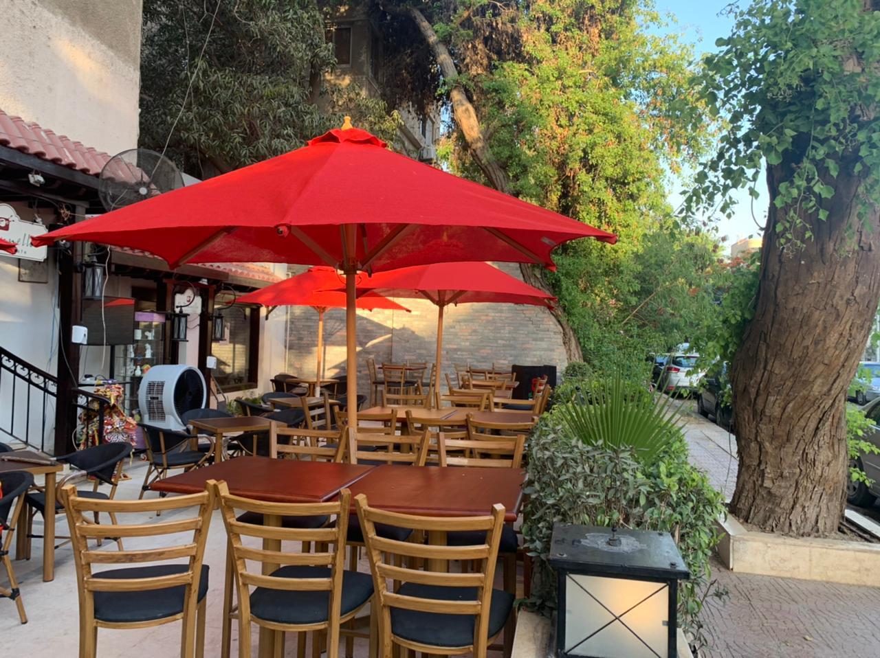 Several large, bright red umbrellas are scattered throughout the area, not only adding a lively aesthetic touch but also providing much-needed shade for customers during sunny weather. The entire set is designed to withstand frequent use and weather conditions, making it suitable for restaurants and cafes.