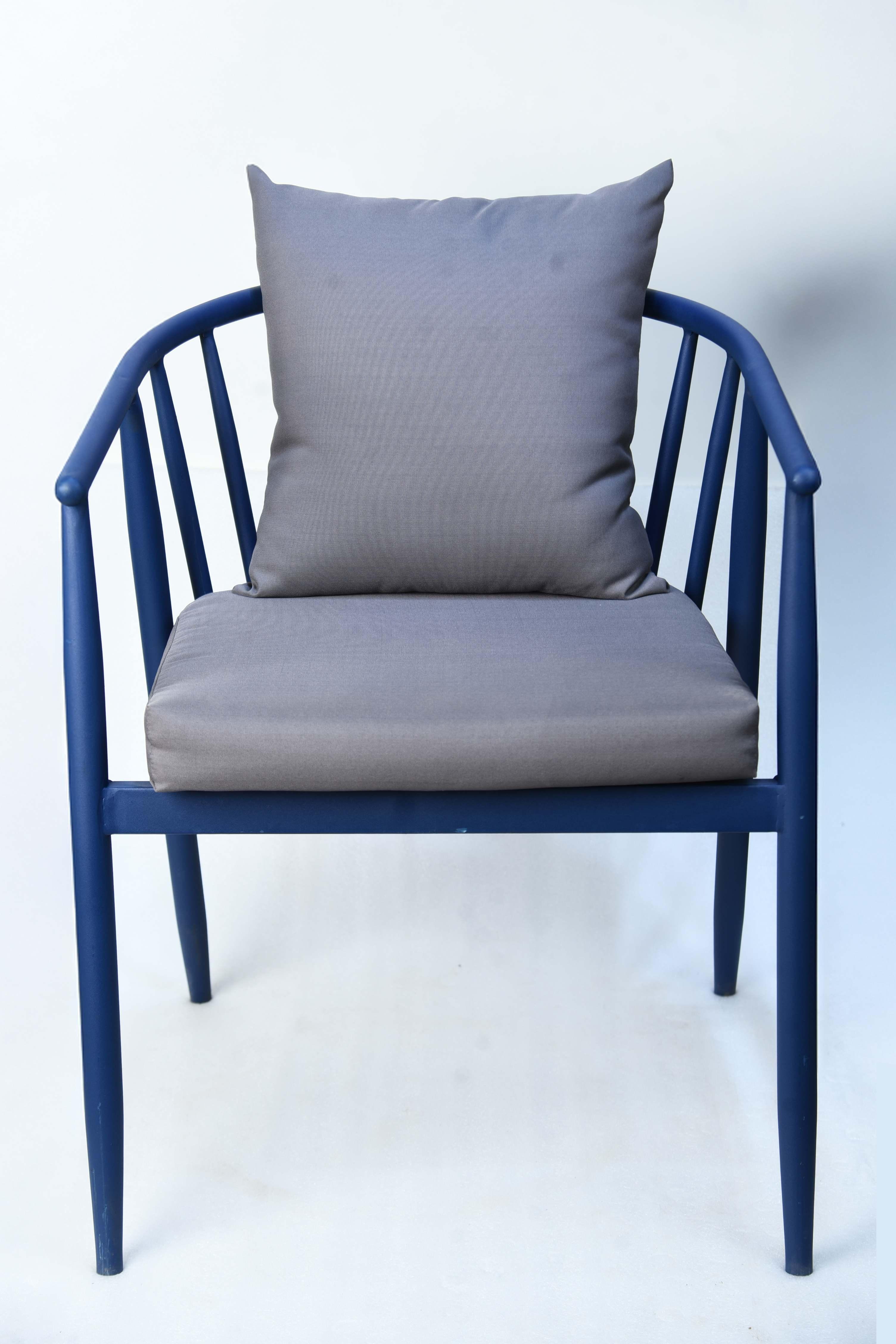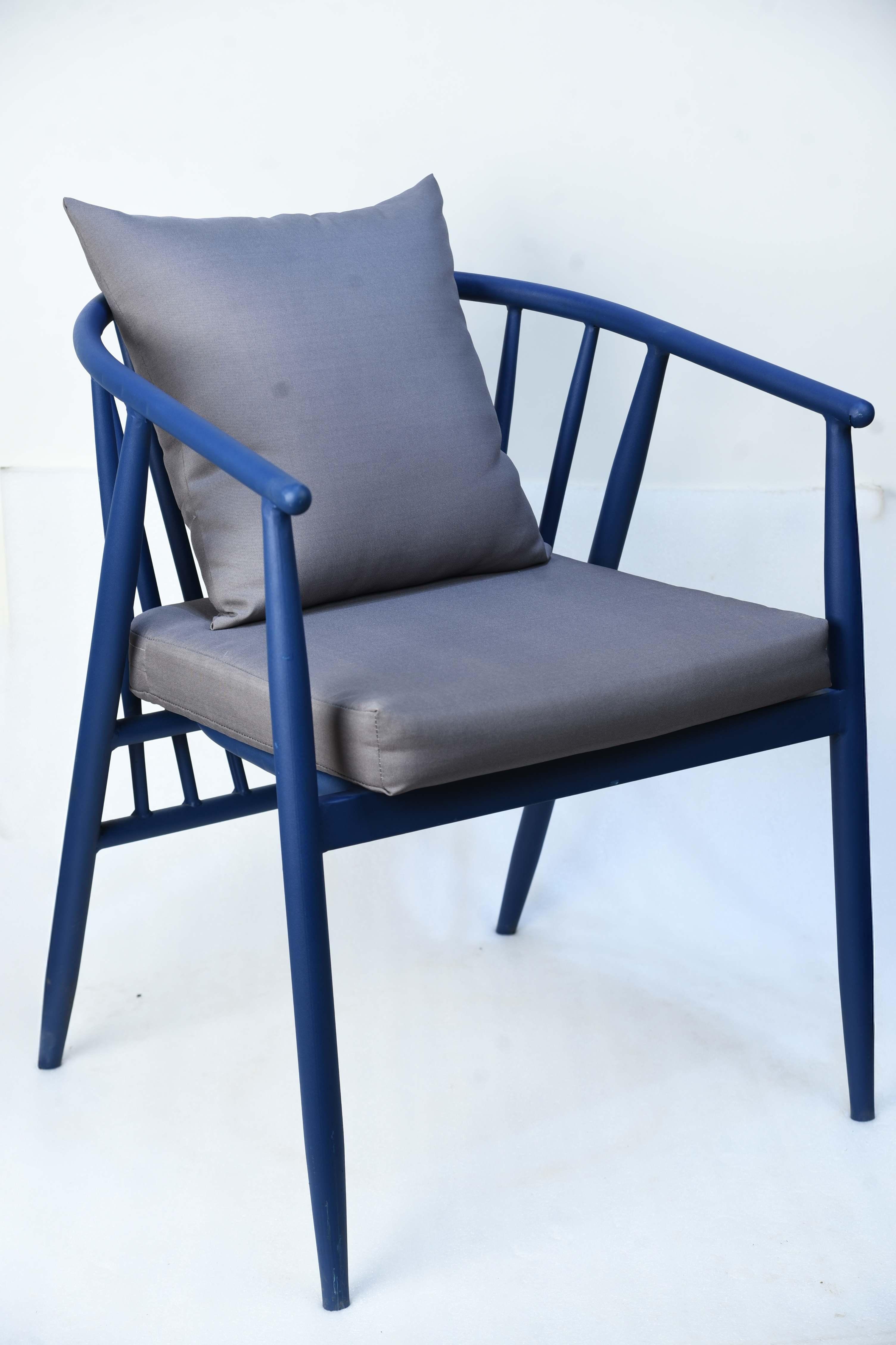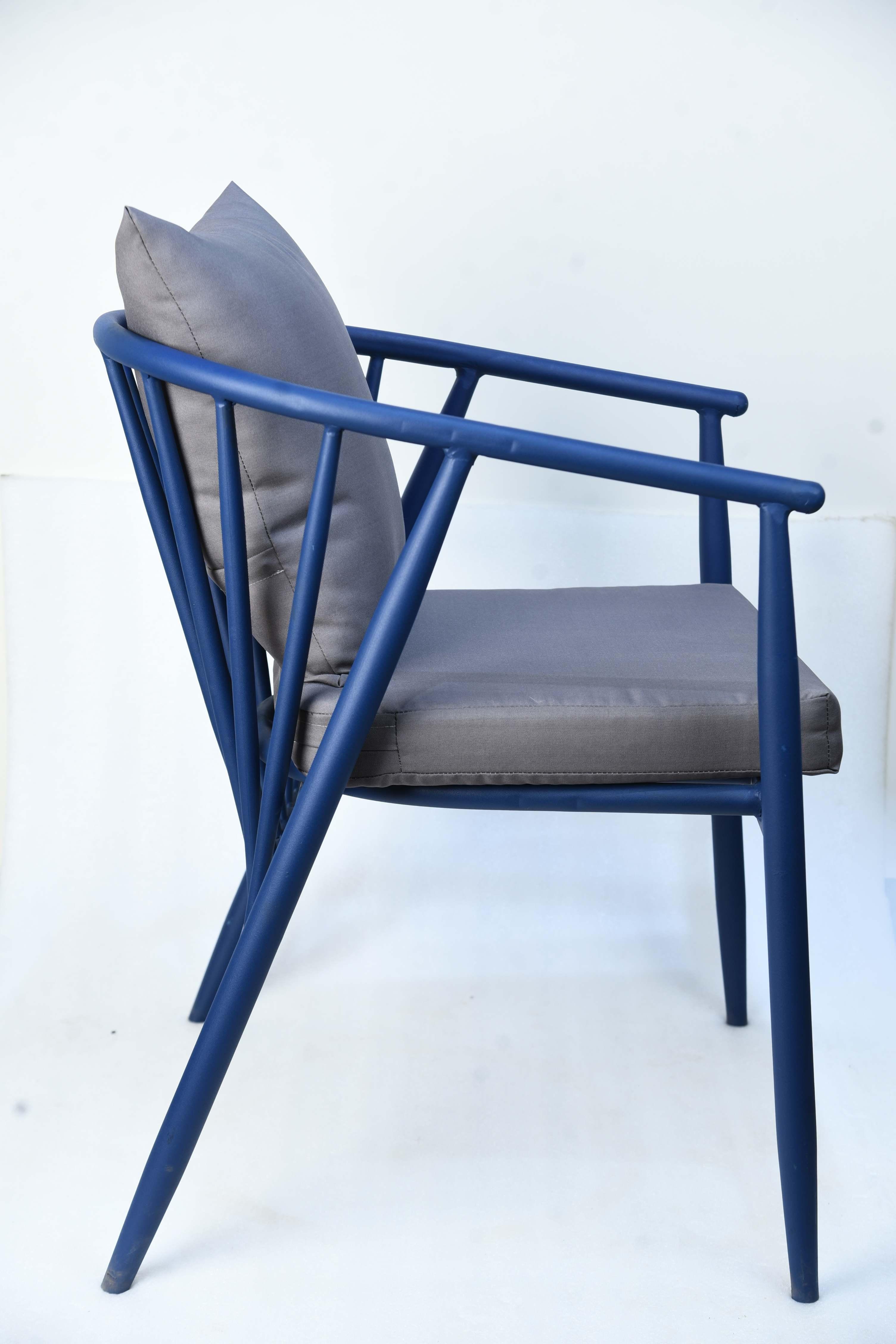 The Azuri chair is a distinctive piece of furniture, combining modern design with superior comfort. It features a solid wood frame in a bold dark blue color, with a curved backrest made of vertical wooden slats, giving it a unique and attractive appearance. The armrests surround the seat, providing additional support and comfort. The two cushions, one for the seat and one for the back, are in a soothing gray color and are made of durable and comfortable fabric. This color contrast between blue and gray gives the chair a modern and sophisticated feel, making it suitable for a variety of interior decors. Materials: