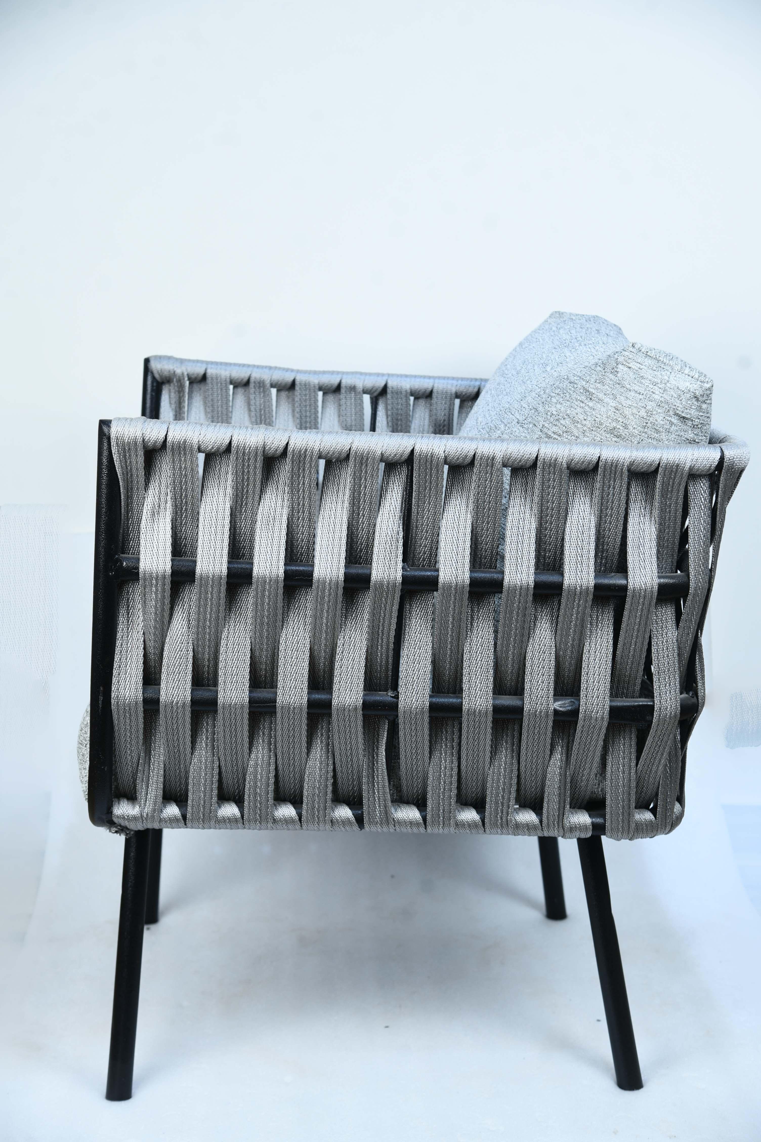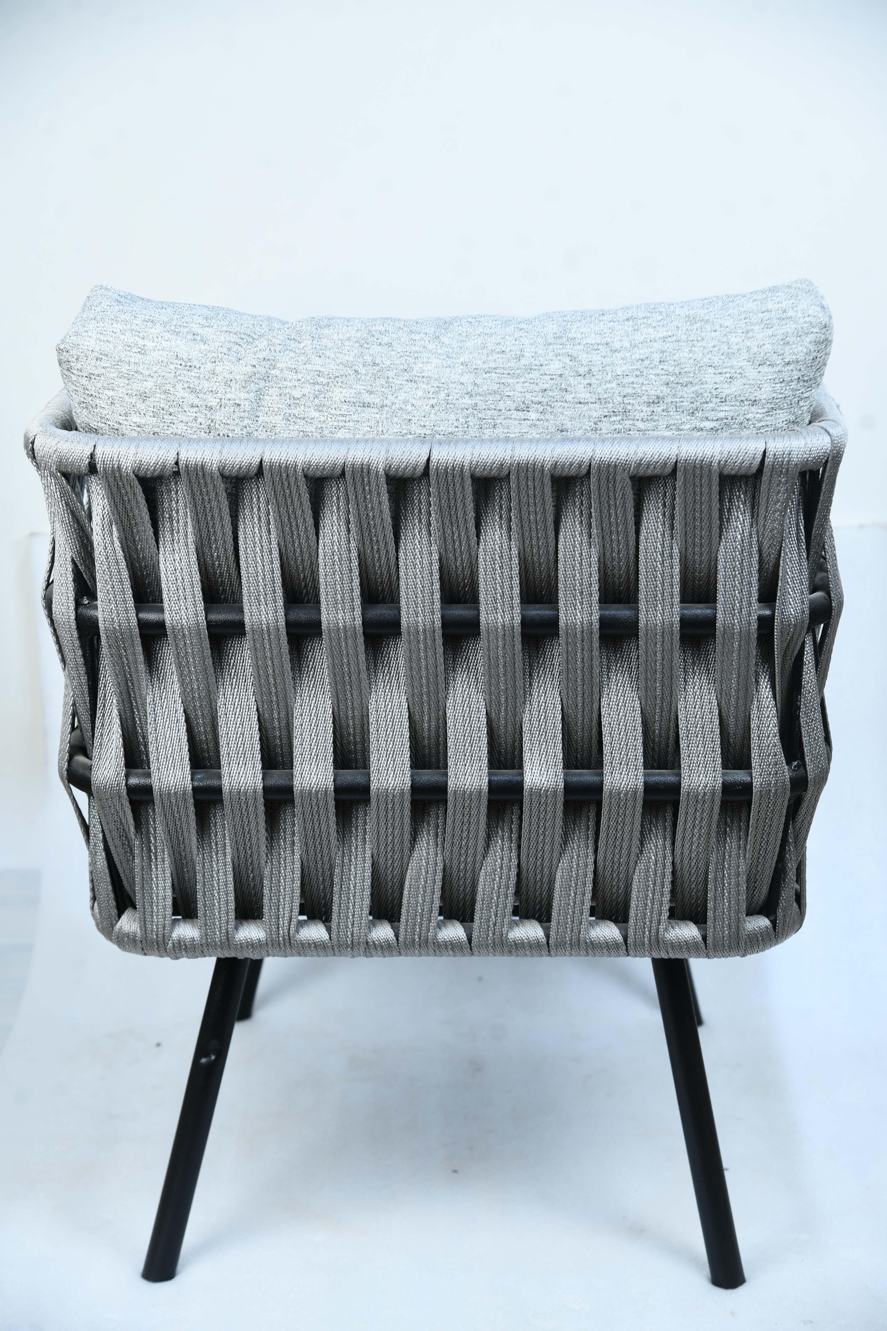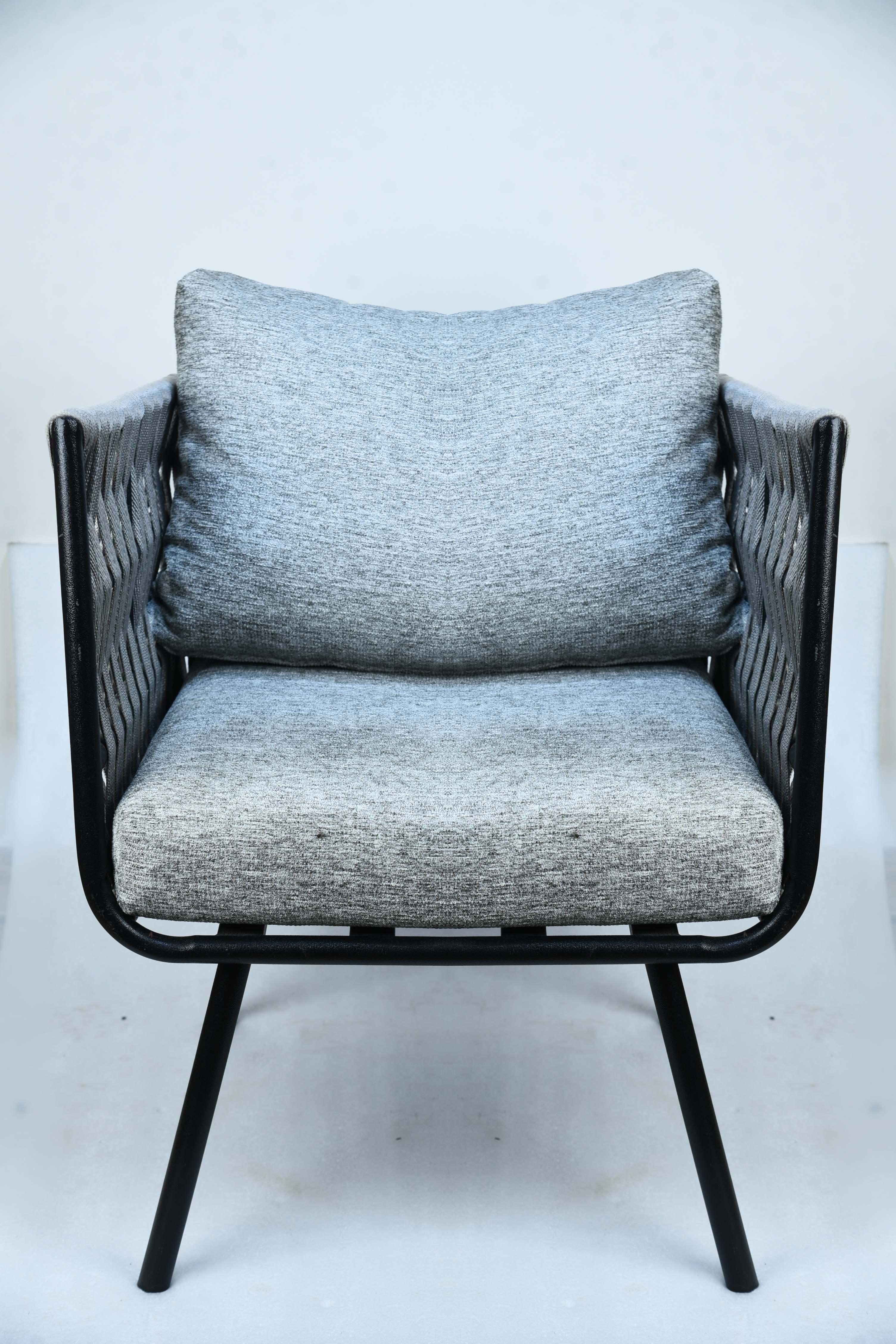 The City Lounge Chair is the perfect addition to modern spaces seeking comfort and elegance. It features a streamlined design with a sturdy metal frame in matte black, giving it a sleek and durable appearance. The seat and backrest are thickly padded and covered in a luxurious light gray fabric, providing a supremely comfortable seating experience. The separate back cushion is in the same color as the fabric for added support and comfort while relaxing. The chair's design makes it a versatile piece, whether in living rooms, reception areas, or even covered porches. Materials: