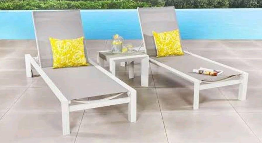 Grey and white double chaise lounge set, specially designed for relaxing by the pool.
