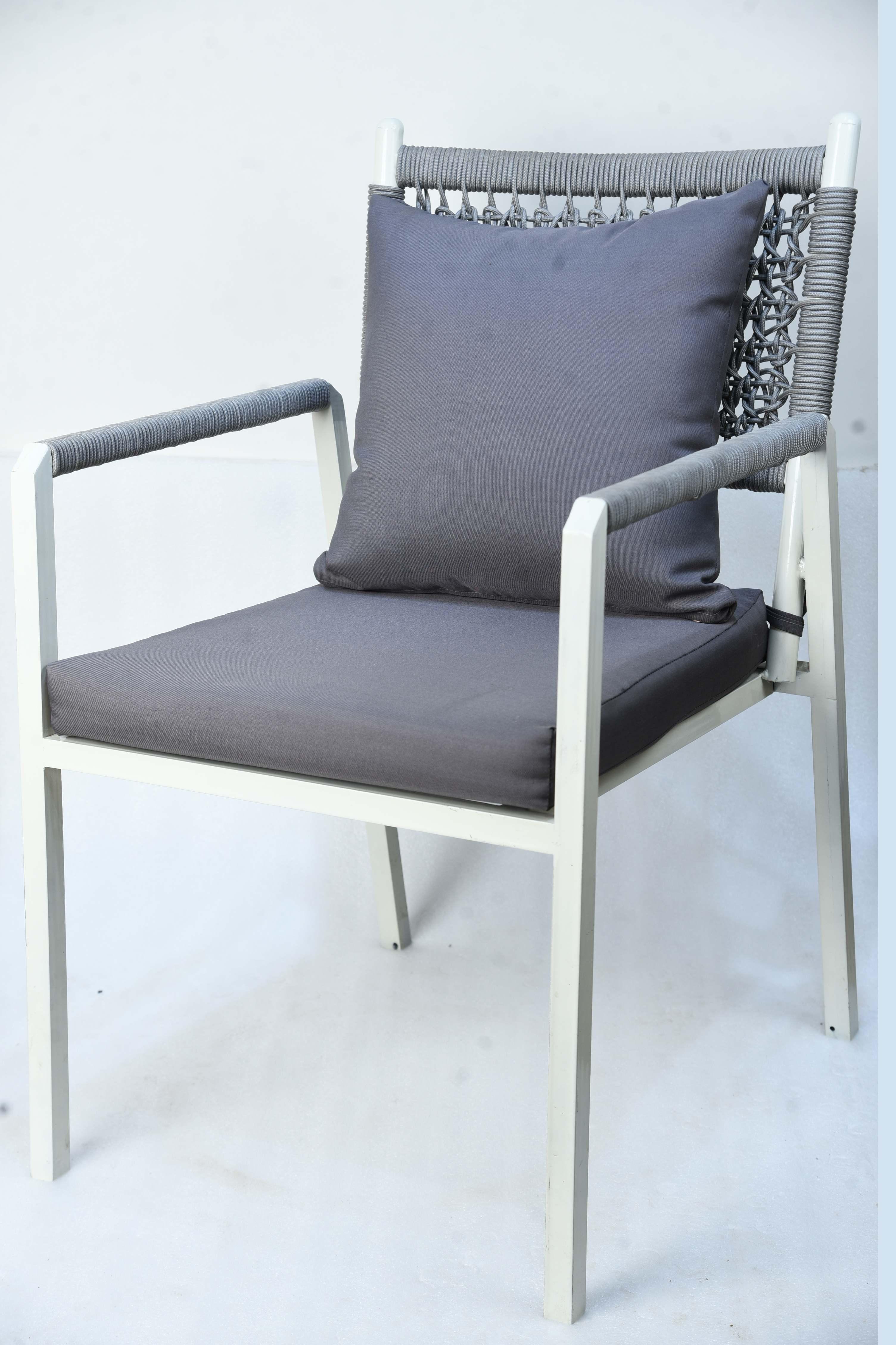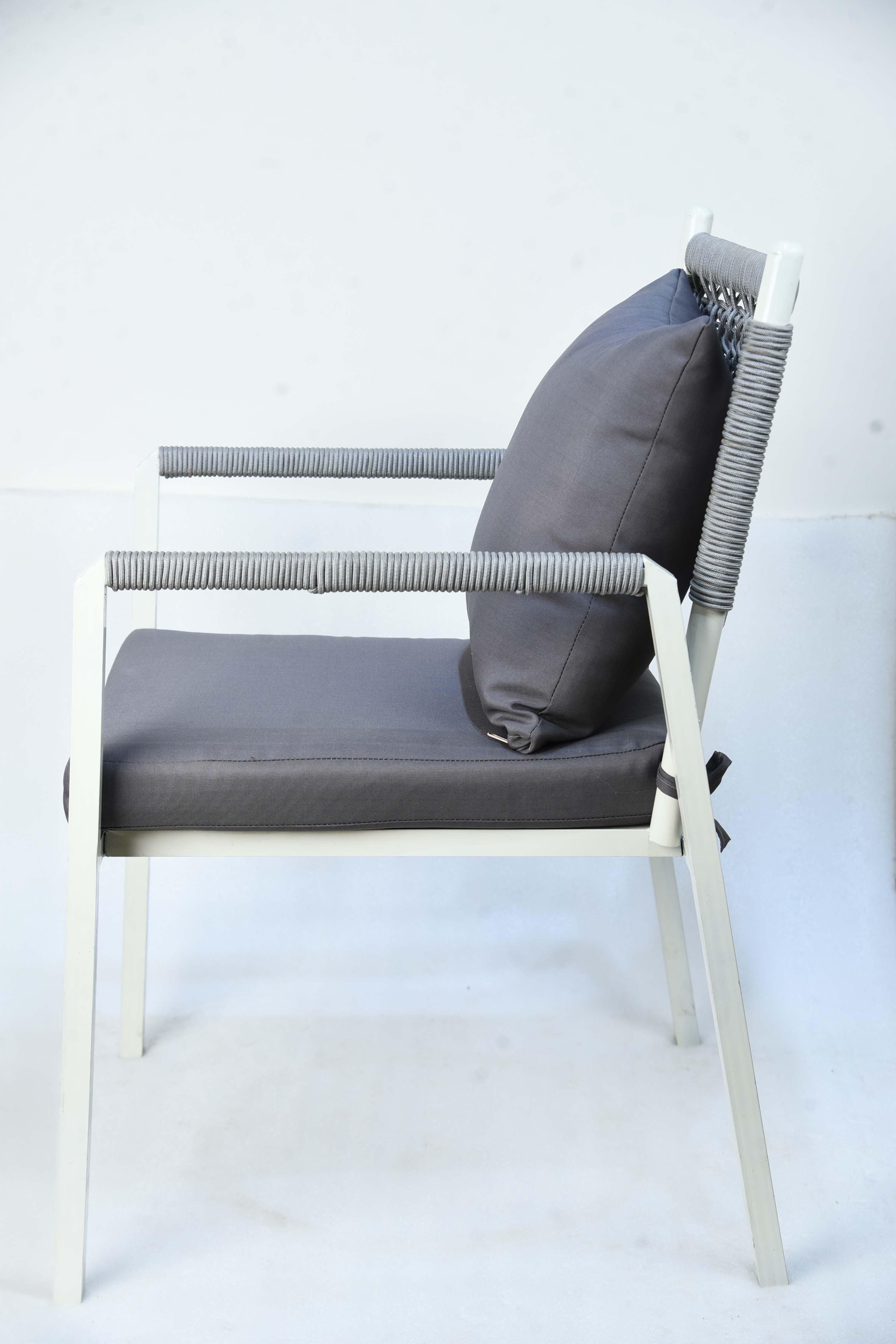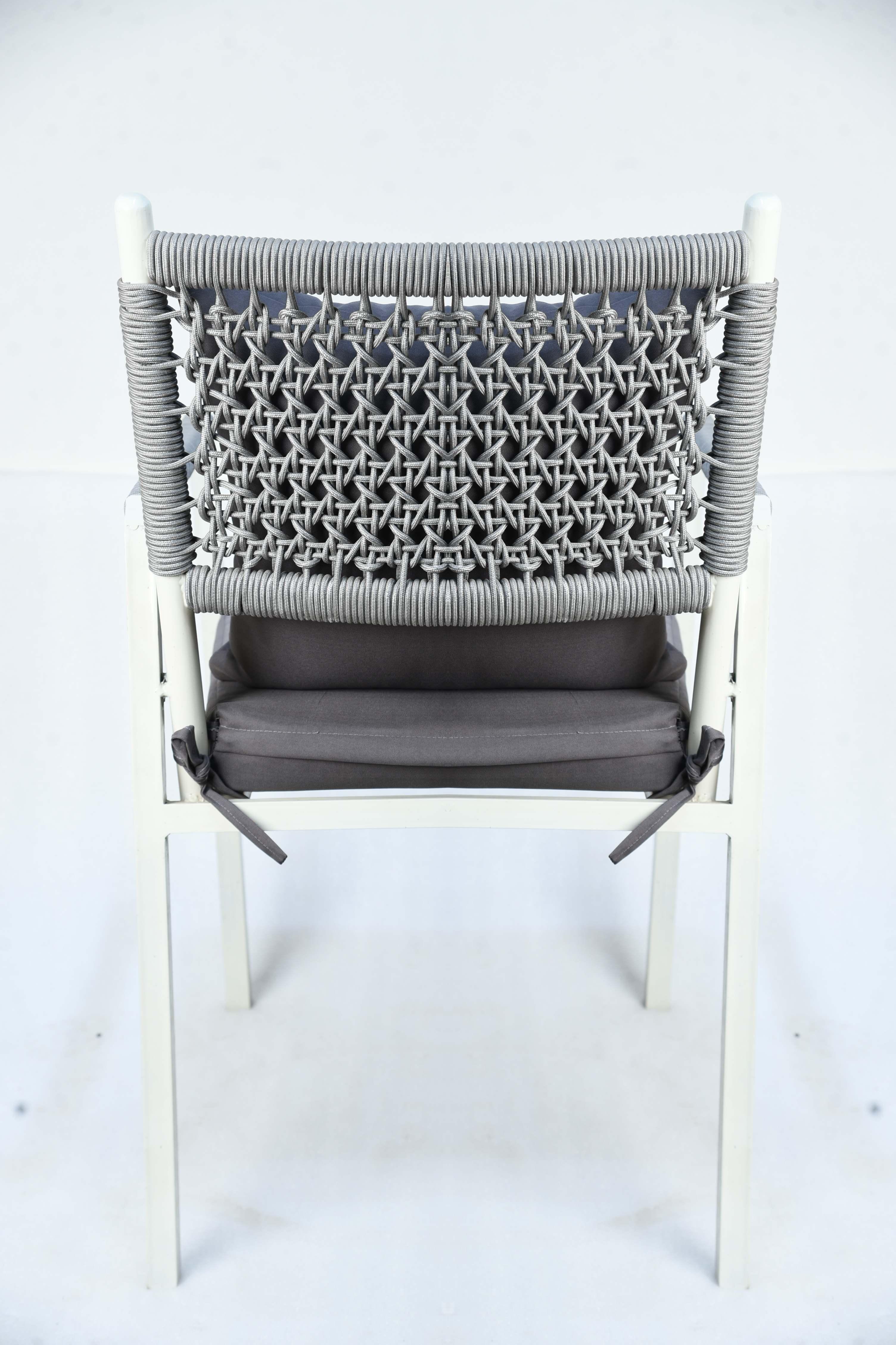 The Miami chair is an ideal piece for outdoor spaces seeking elegance, comfort, and durability. It features a lightweight, sturdy frame made of white-treated aluminum, making it resistant to rust and weather. The chair's unique design is accentuated by the braided rope backrest, giving it a nautical and contemporary feel. The chair comes with two thick cushions, one for the seat and one for the back, in dark gray. The cushions are made of water- and fade-resistant fabrics, ensuring they maintain their quality and stylish appearance under sun and rain. Materials: