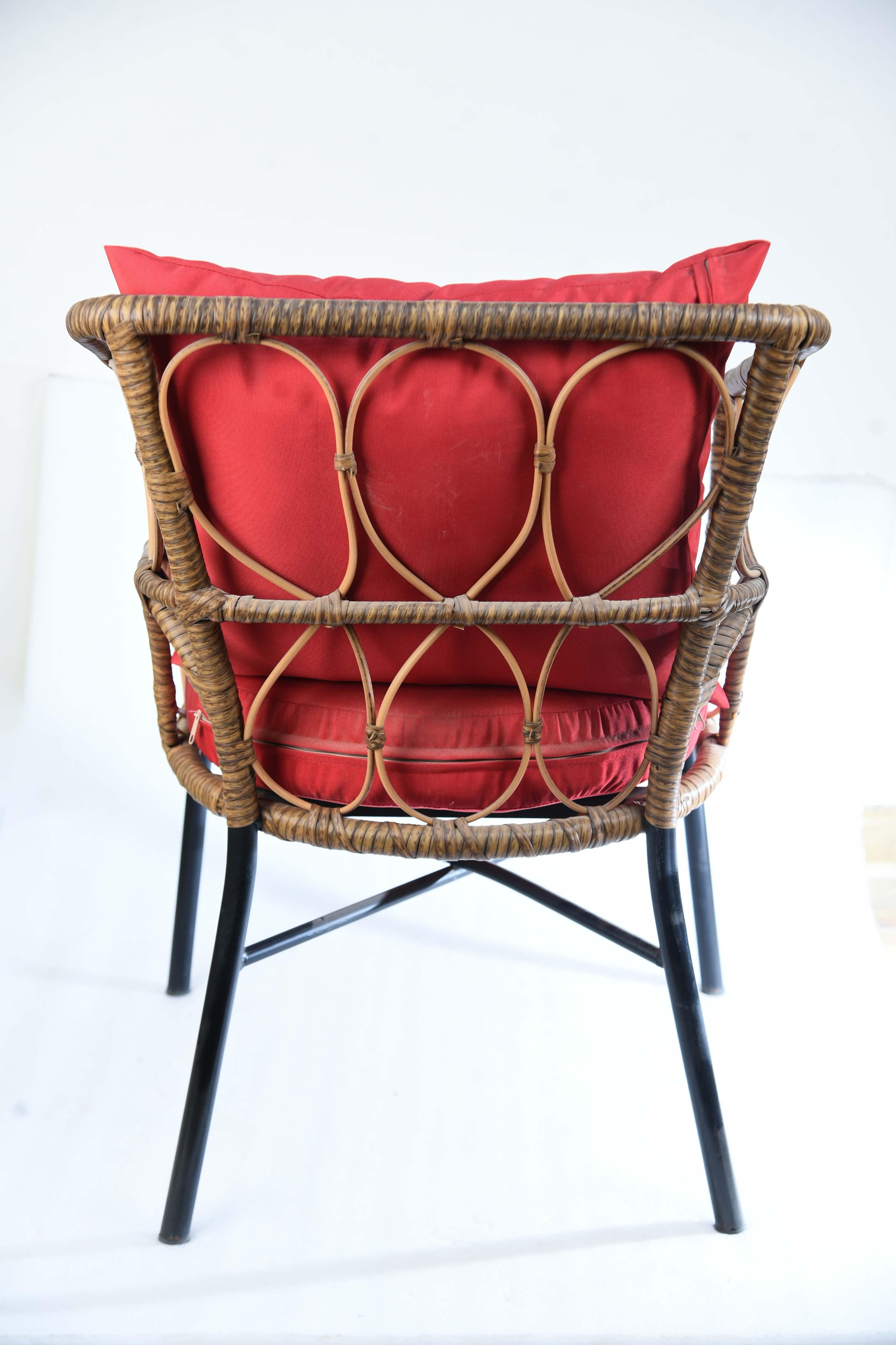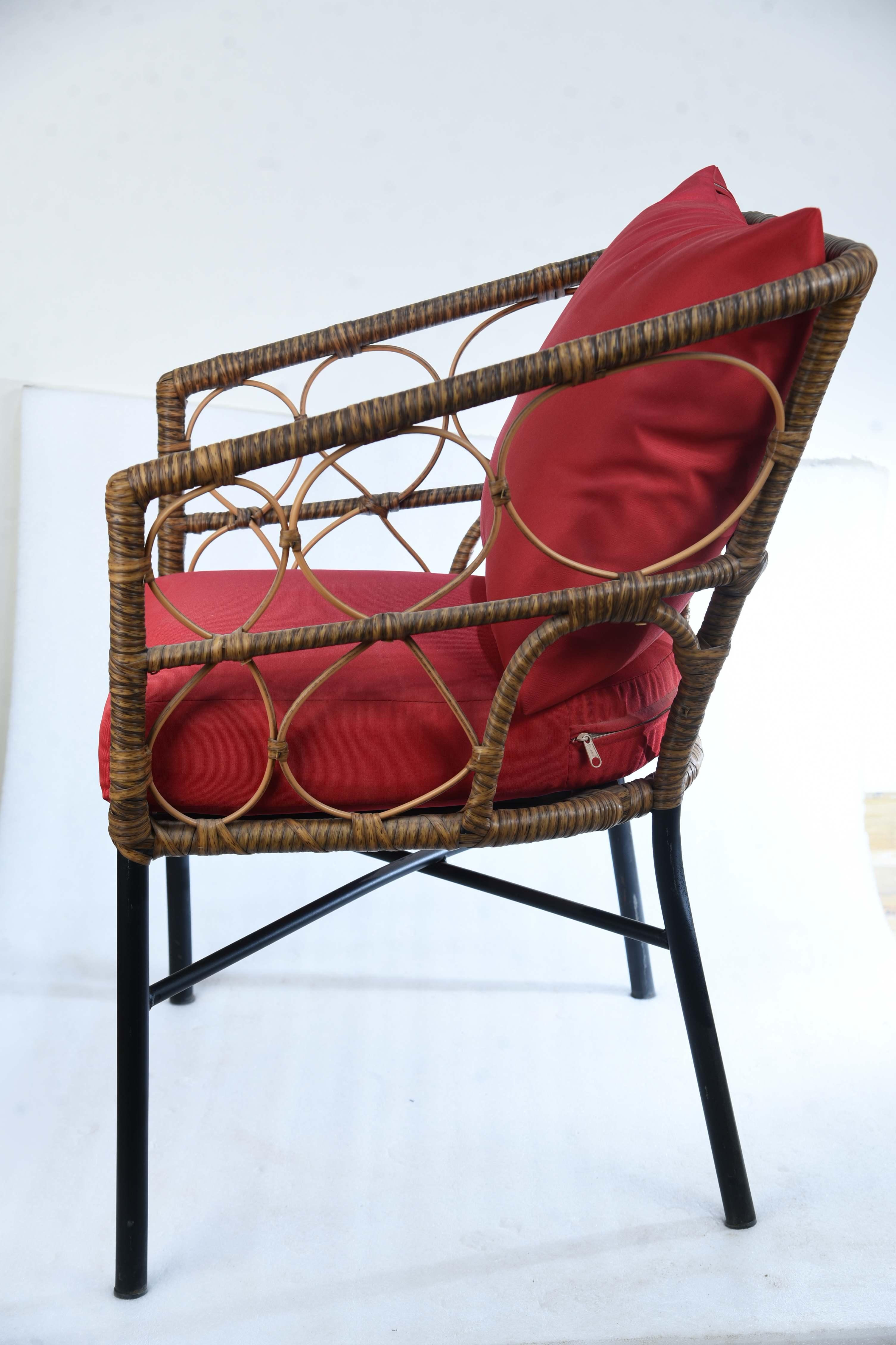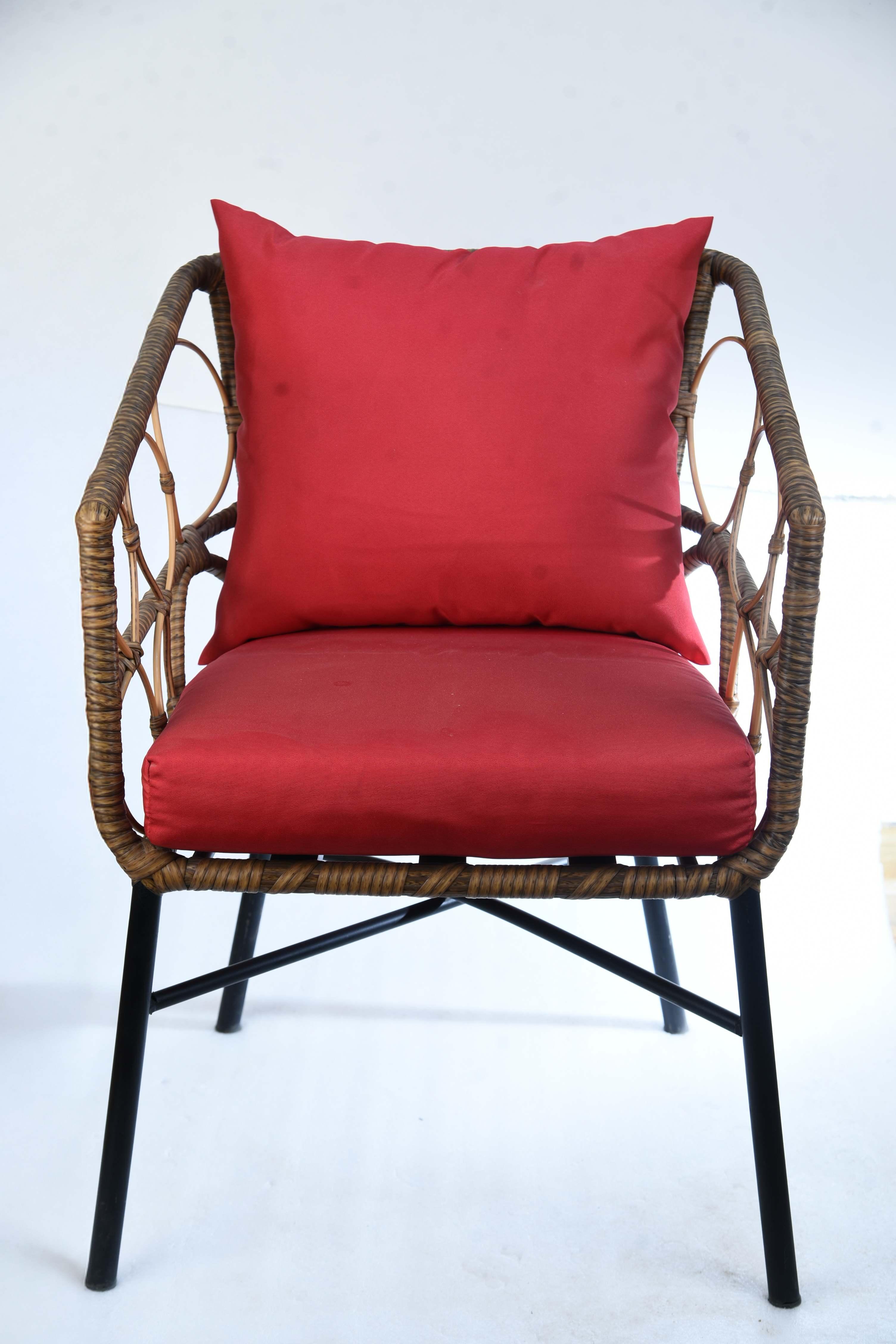 The Red Wave Chair is the perfect piece of furniture to add a touch of elegance and comfort to your outdoor space. It features a high-quality, dark brown synthetic rattan design, artfully woven to give the chair a natural yet durable appearance. The chair comes with thick, bright red seat and back cushions made of weather-resistant fabric, ensuring maximum comfort and durability. The chair's frame is supported by a black metal frame, ensuring stability and strength. Materials: