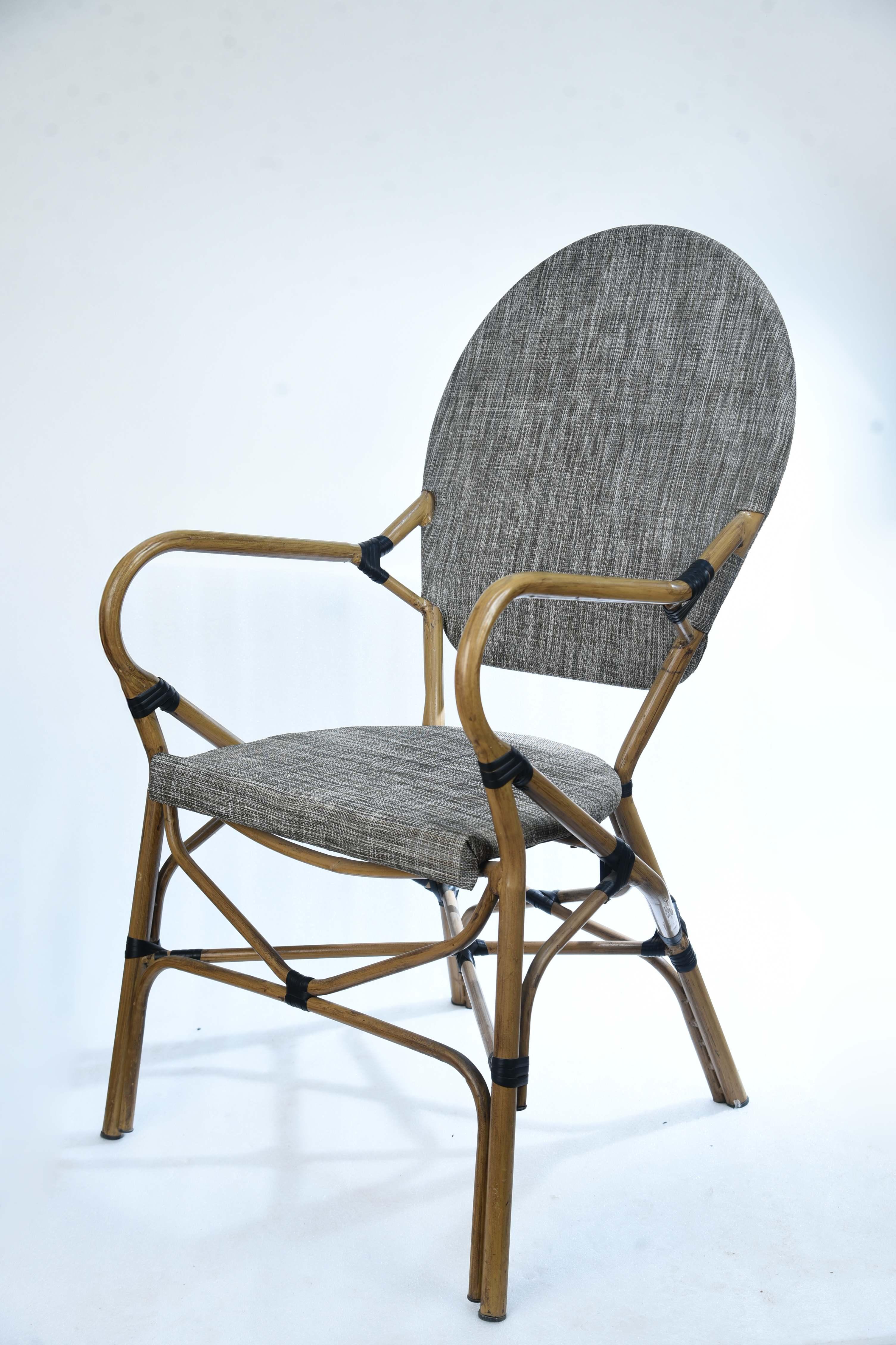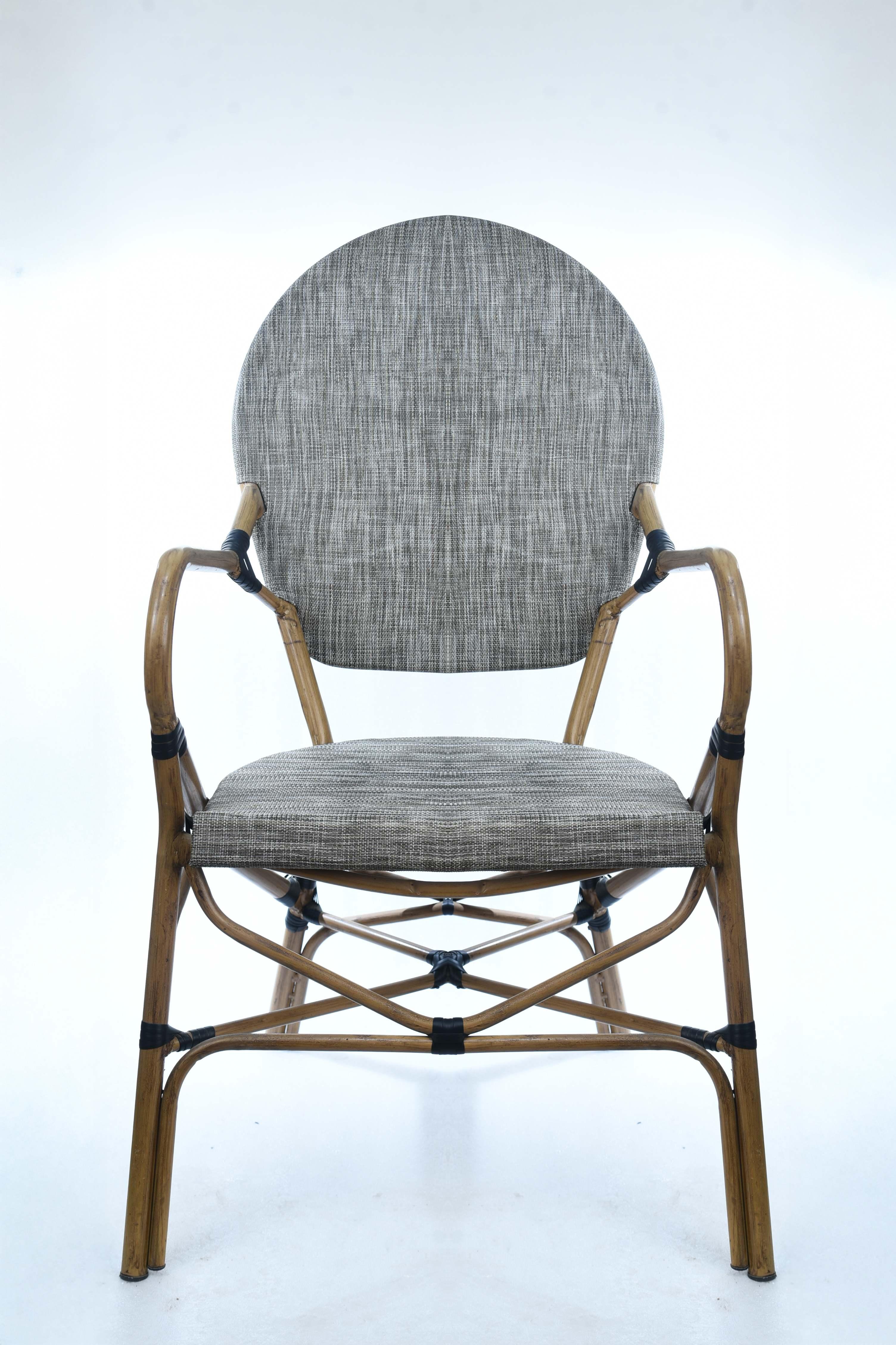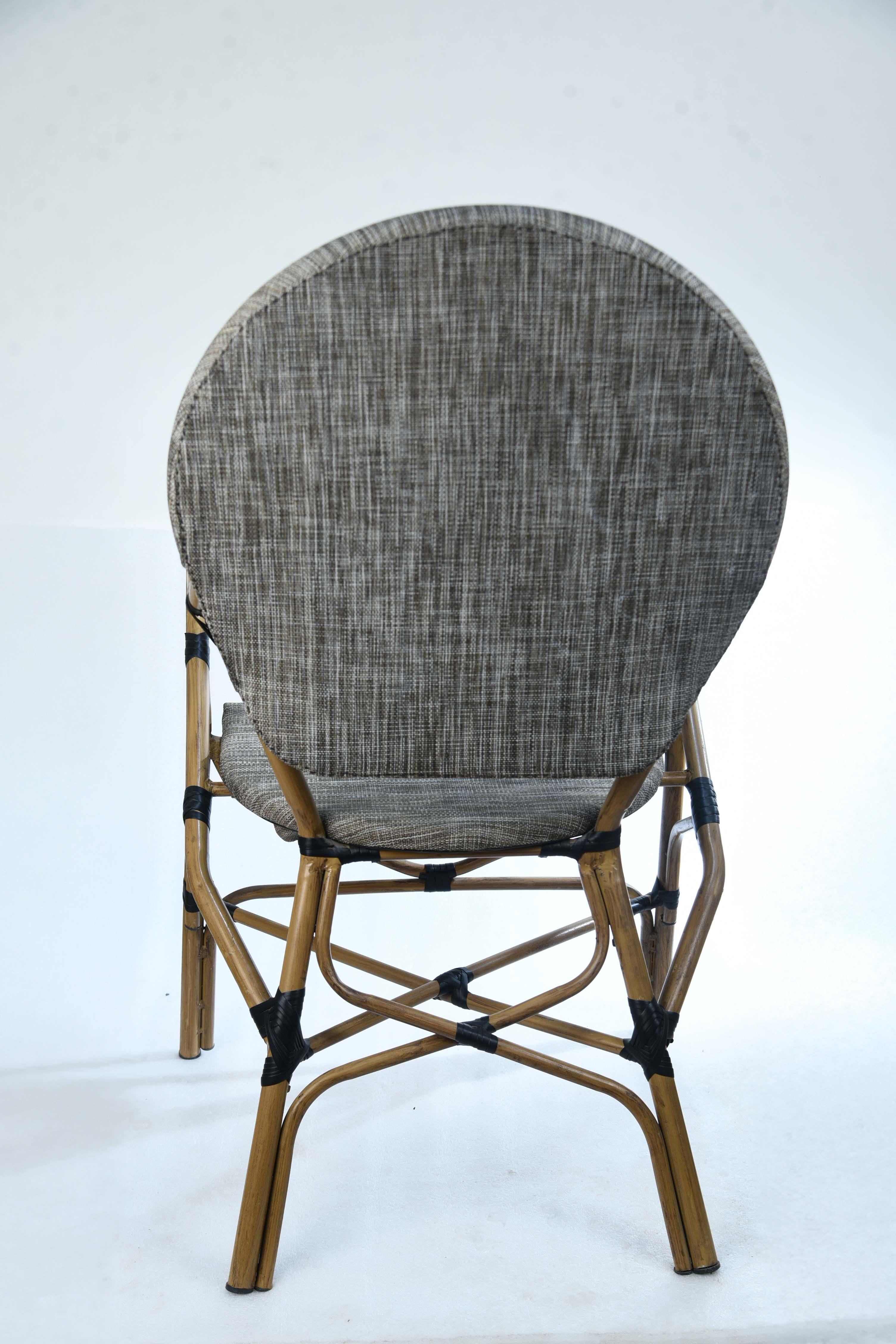 An elegant chair that combines a natural rattan frame with luxurious grey fabric upholstery, adding a touch of elegance and comfort.
