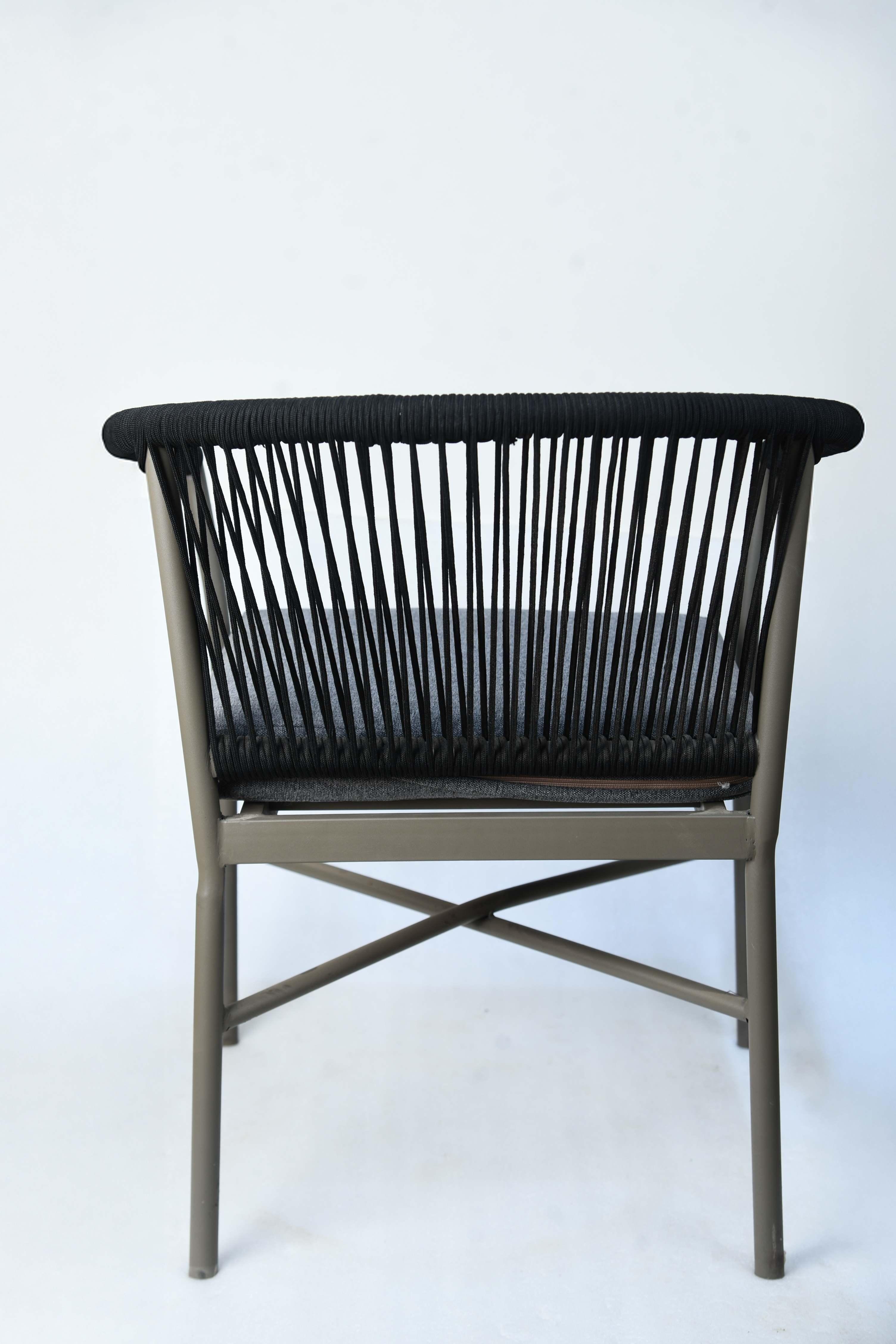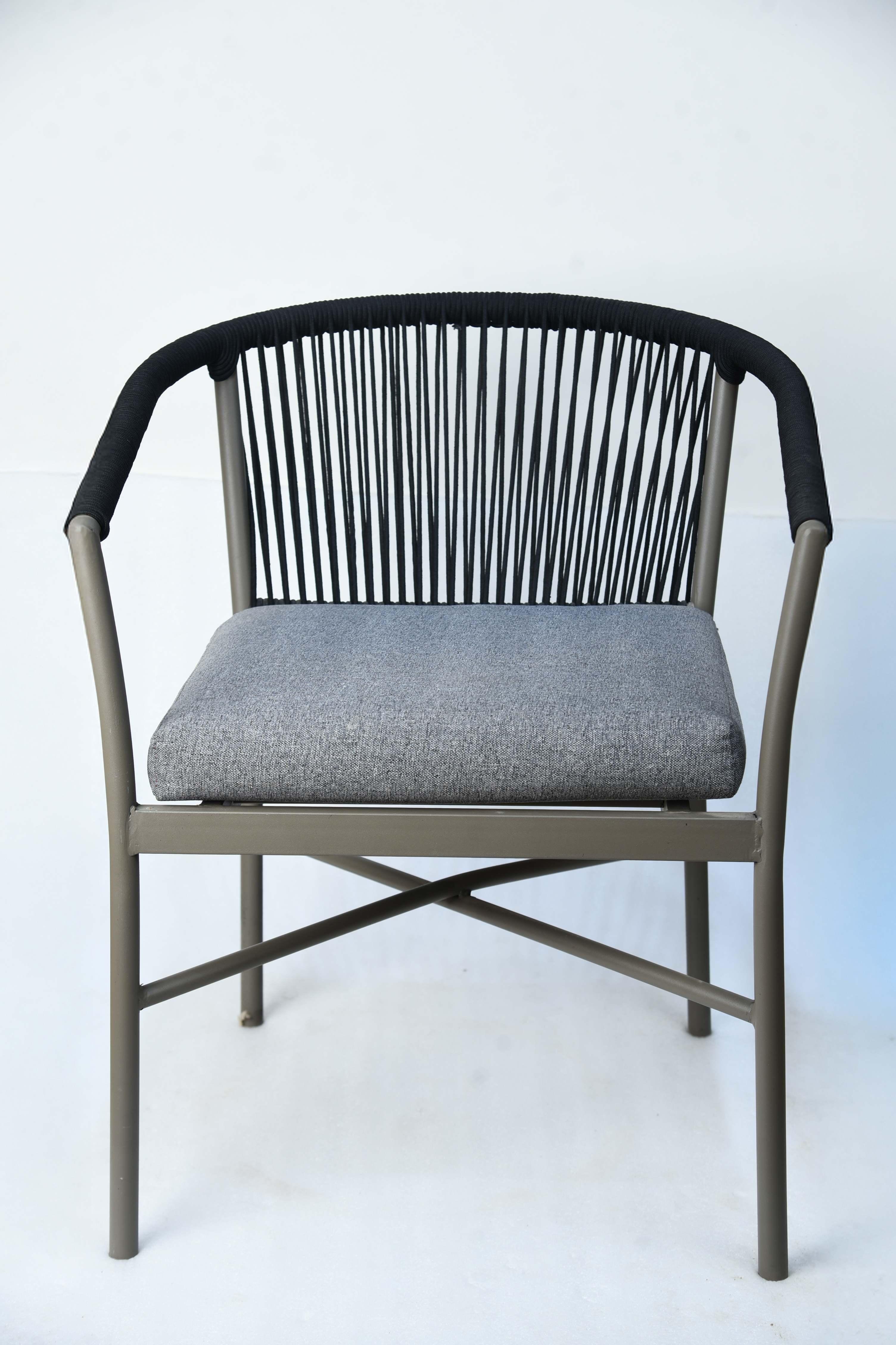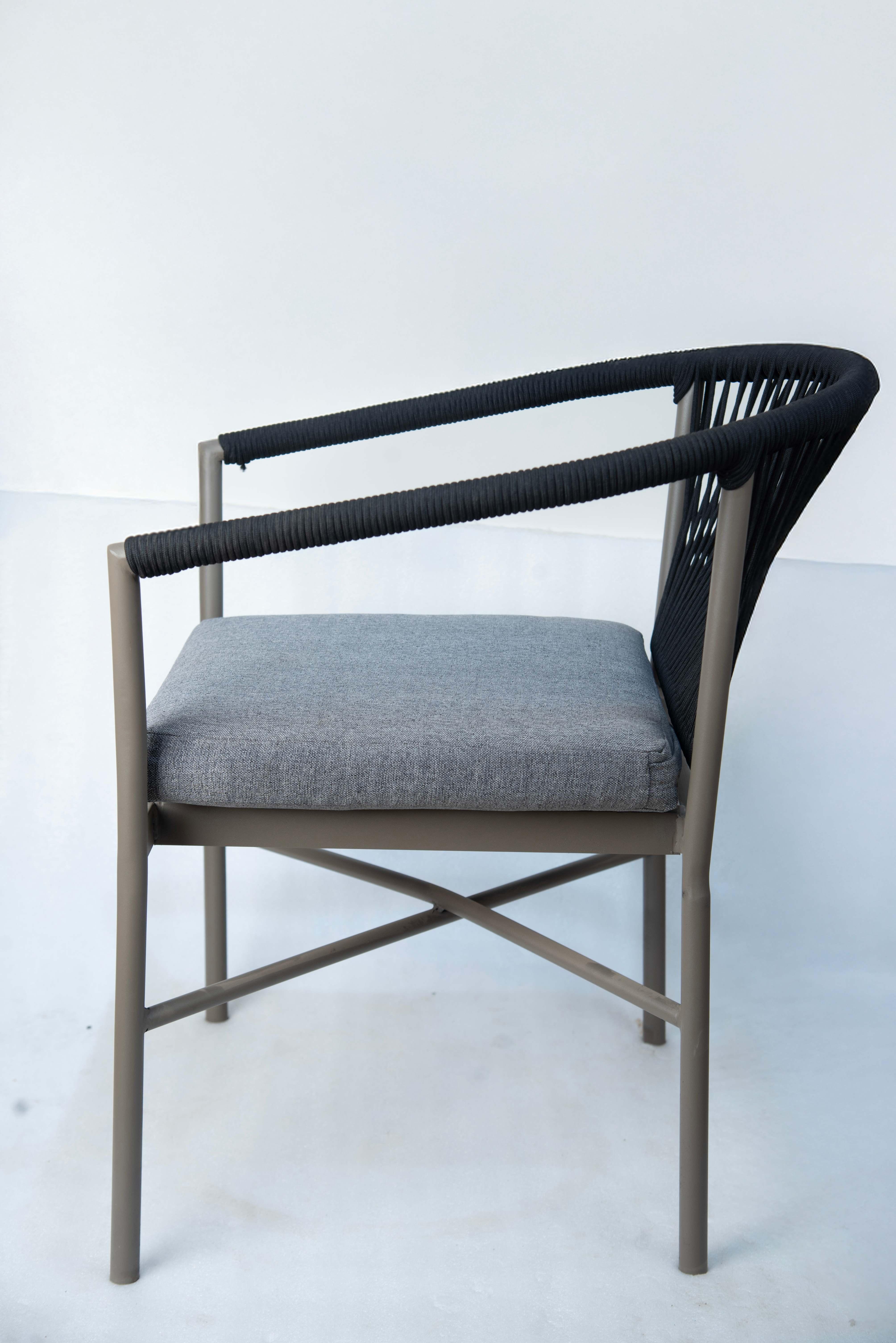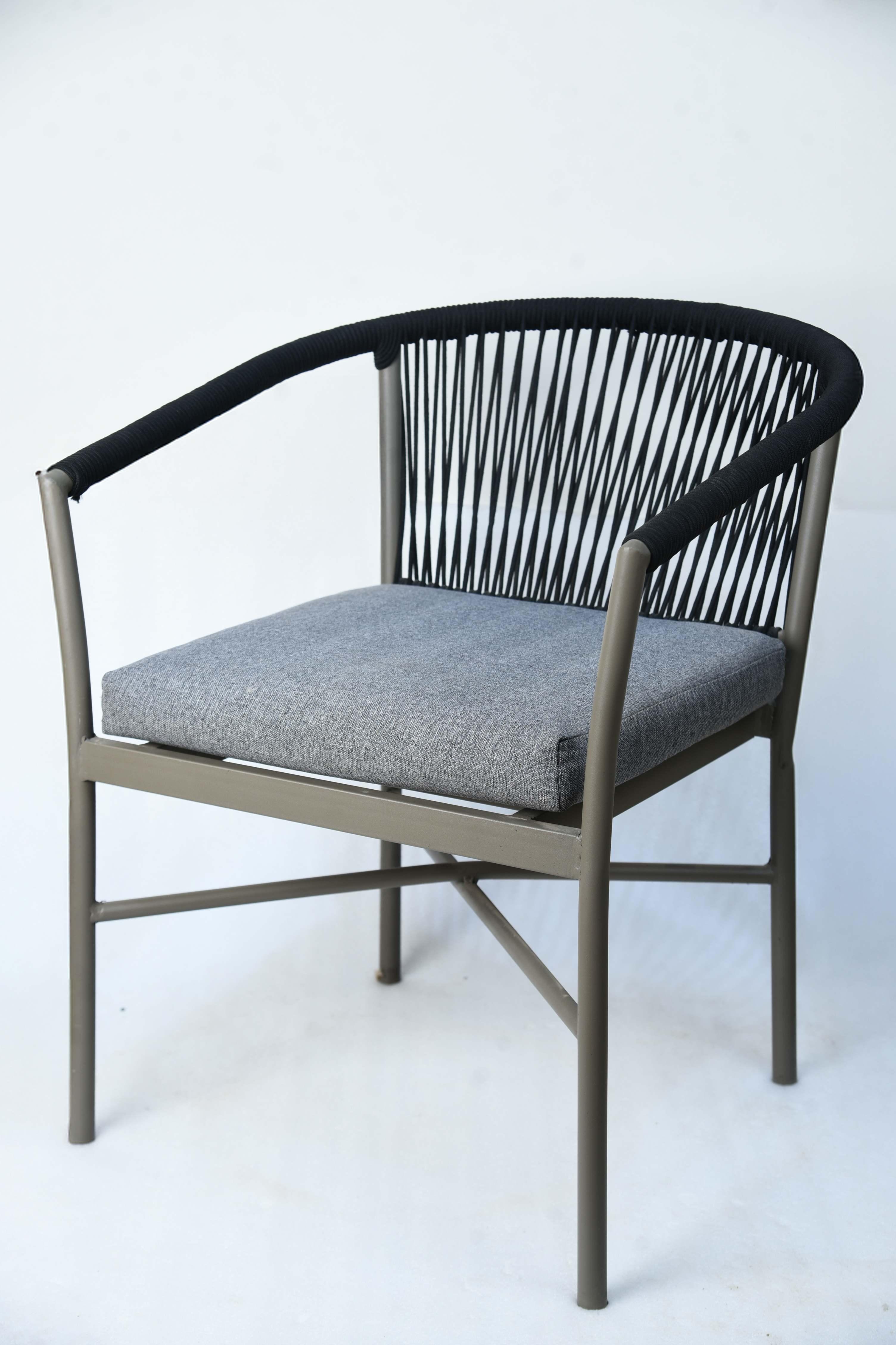 The Urban Chair is a practical and elegant piece of furniture, combining modern simplicity with a handcrafted touch. It features a sturdy, dark gray metal frame, ensuring durability. The backrest is handwoven with strong black ropes, giving it a unique and aesthetic appeal. For maximum comfort, the chair features a thick, light gray seat cushion made of durable fabric suitable for everyday use. The contrast between the metal frame and the black fabric adds an elegant touch, while the slim, crossed legs provide superior stability. Materials:
