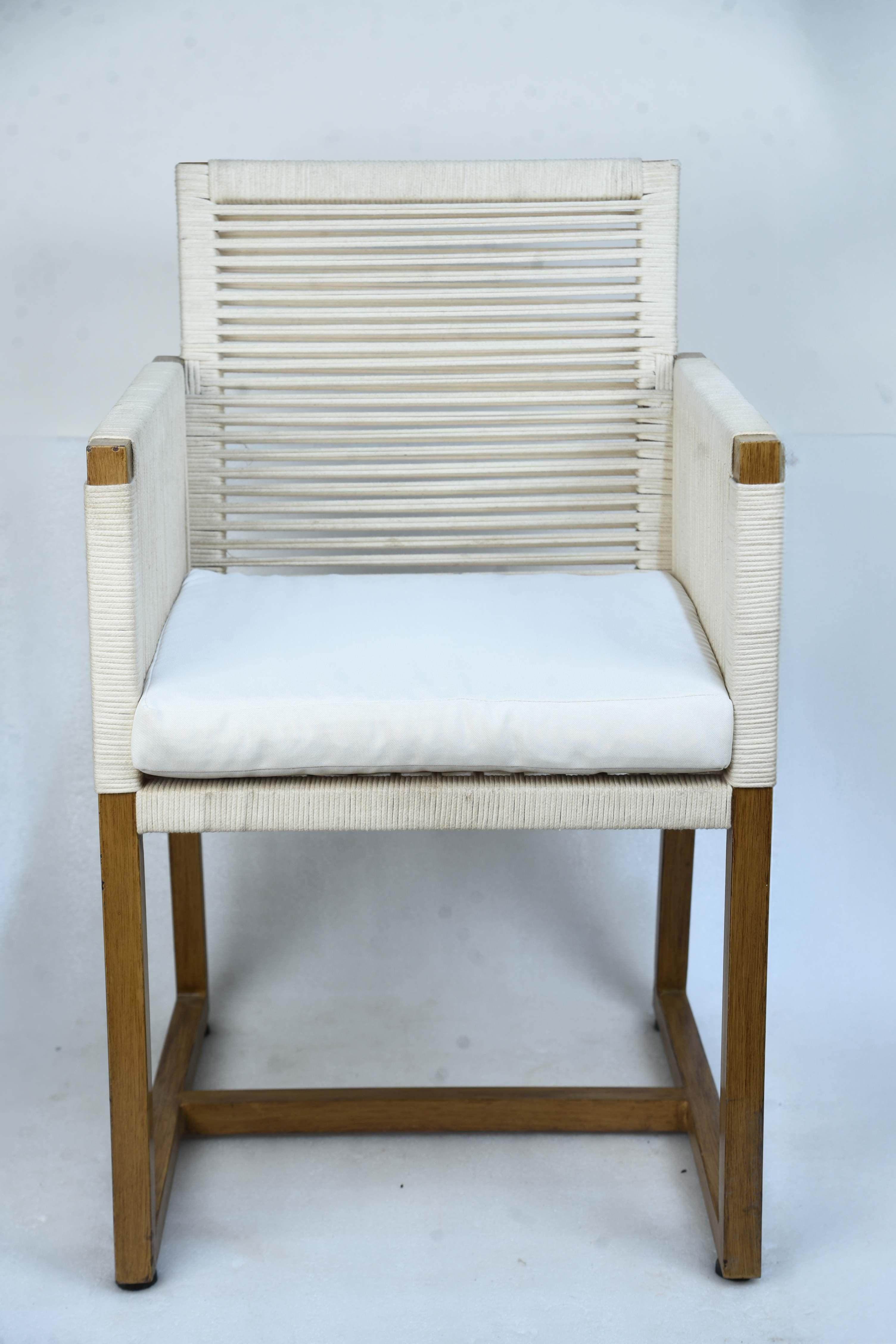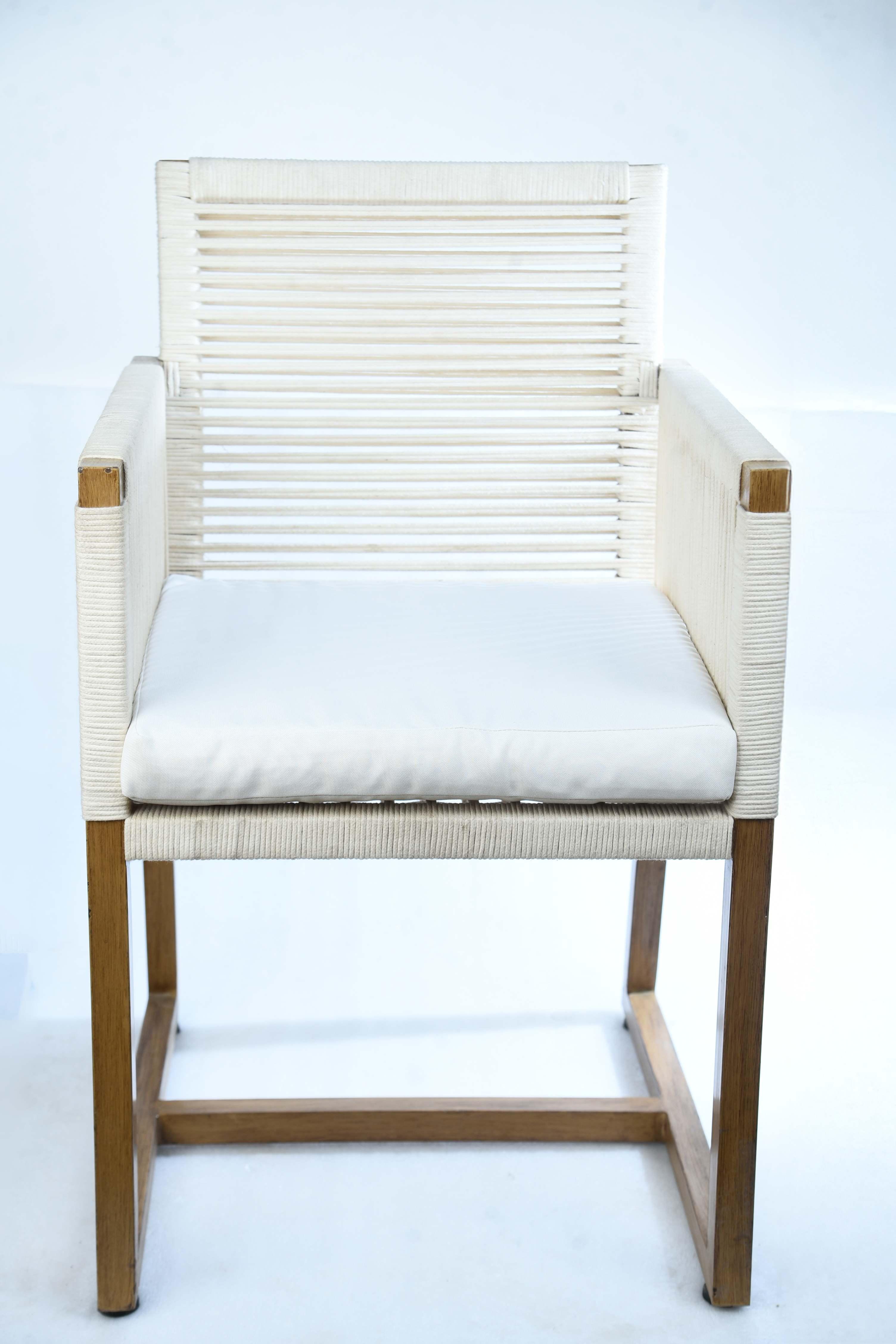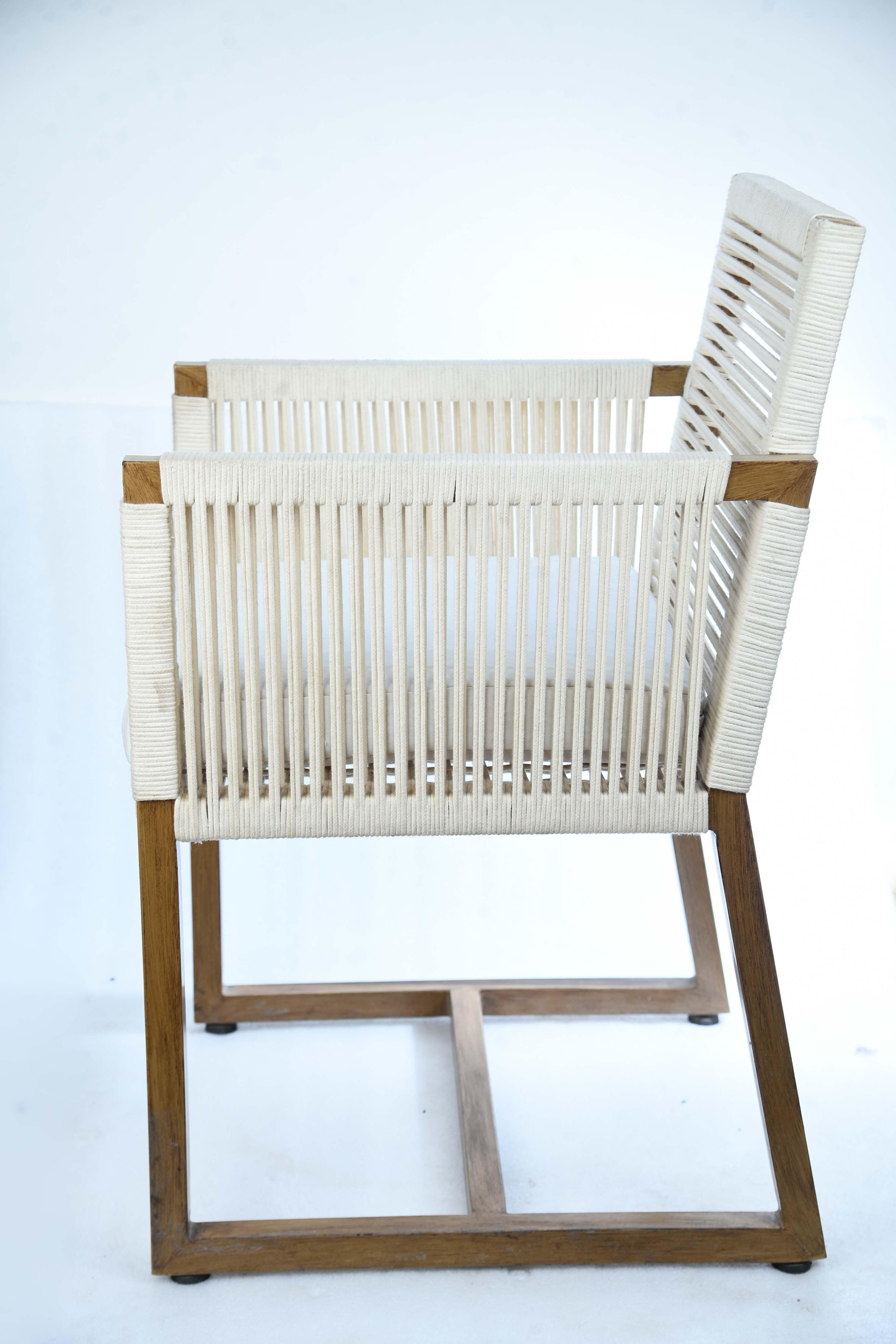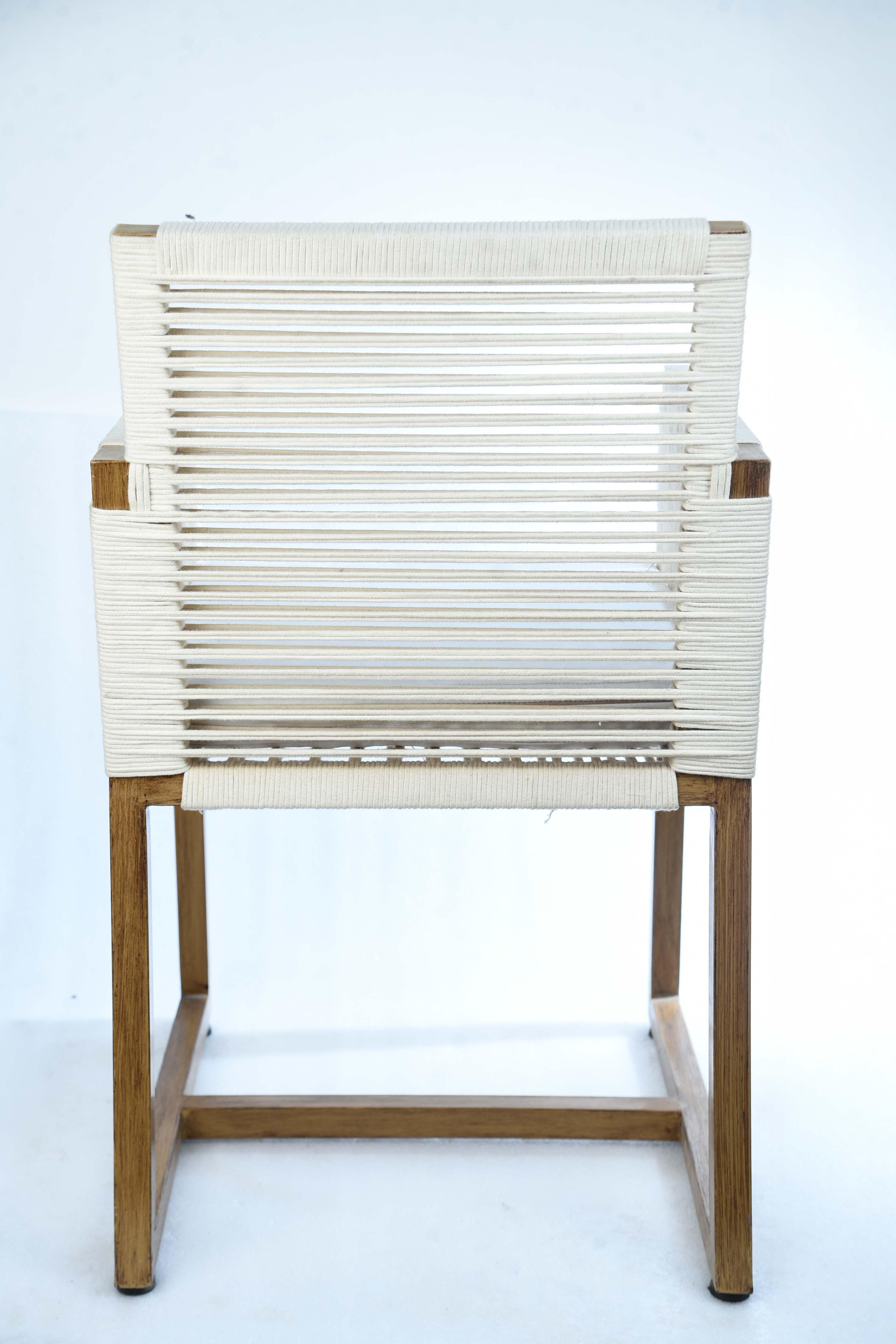 The White Rope Chair is an elegant and simple piece of furniture, combining the natural warmth of wood with a modern touch of textiles. It features a frame made of natural wood in a light color, and a backrest and arms woven with sturdy white ropes, giving it a light and fresh appearance. The chair comes with a thick, crisp white seat cushion made of comfortable, high-quality fabric for maximum comfort and relaxation. The chair's design makes it ideal for spaces seeking a calm and serene atmosphere. Materials: