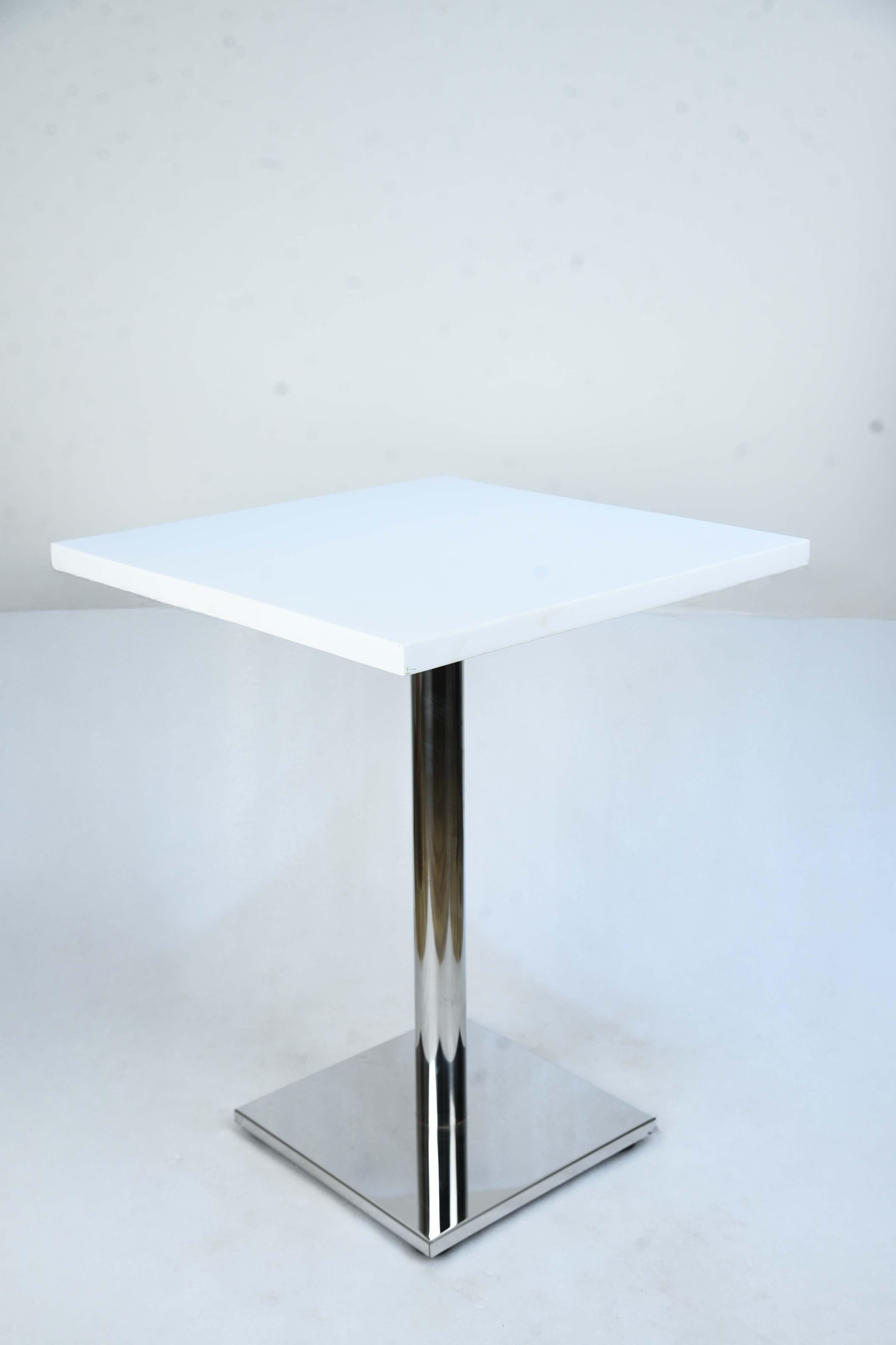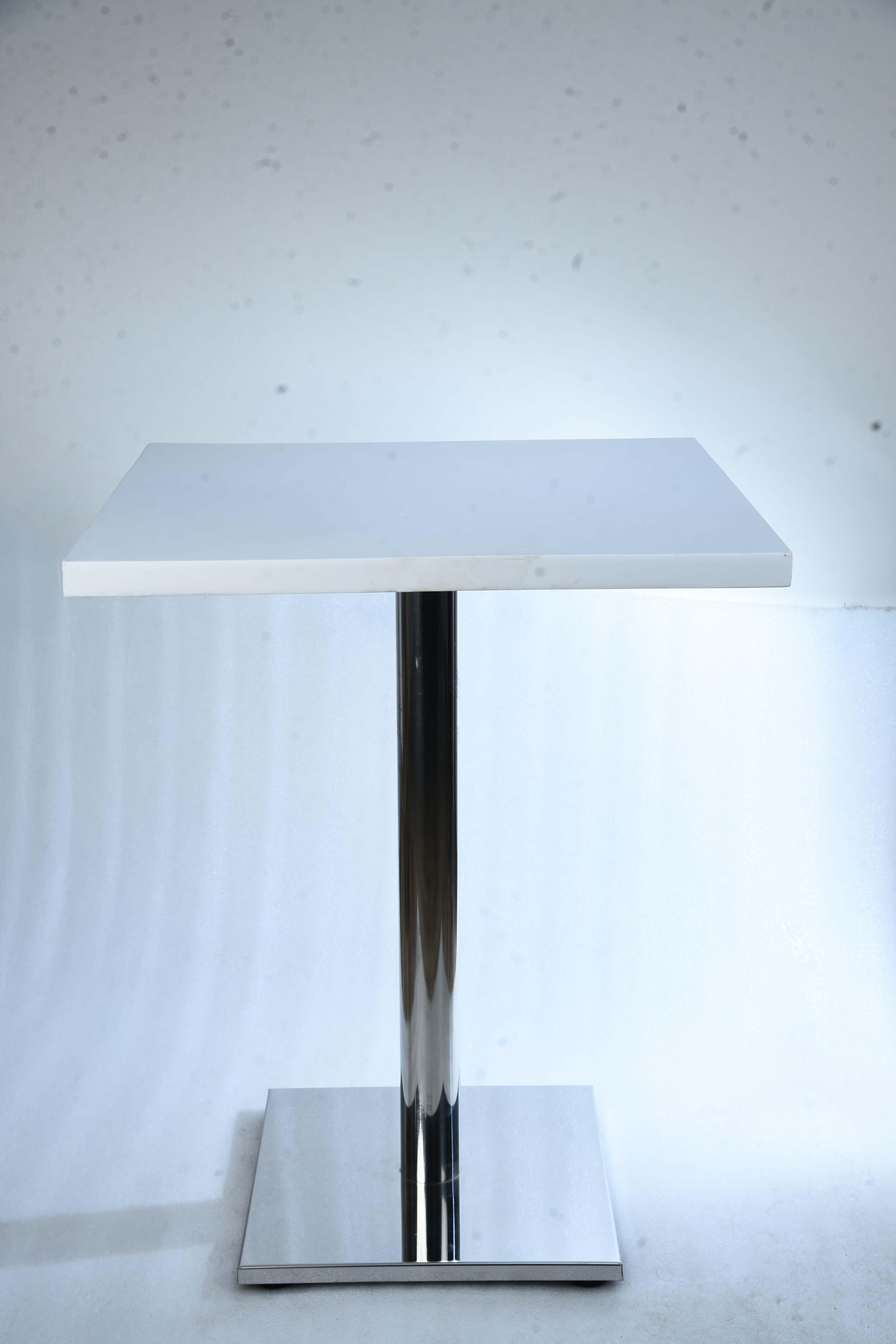 A modern and elegant table with a simple design, featuring a crisp white top and a shiny silver metal base. Available in all colors.