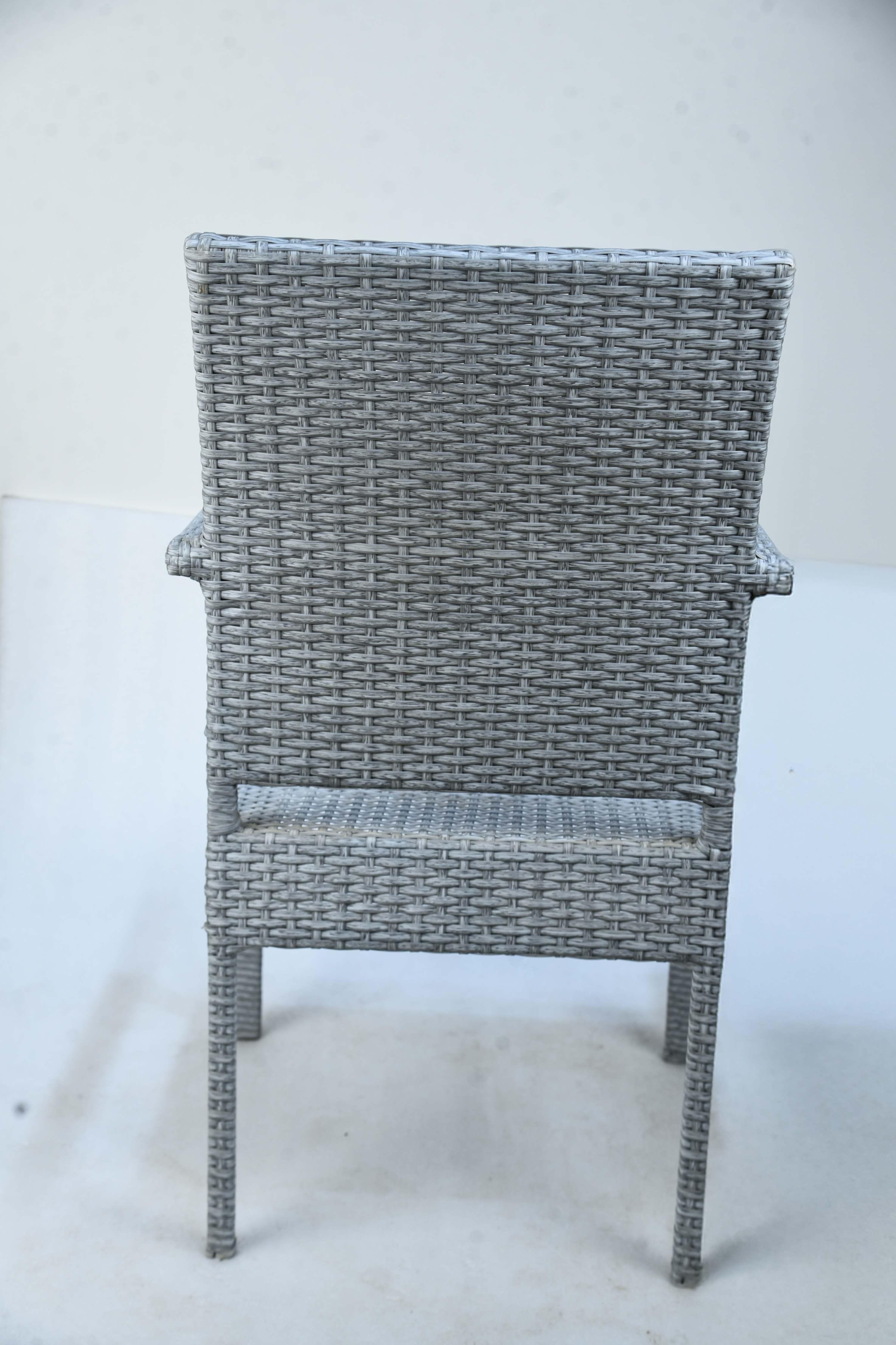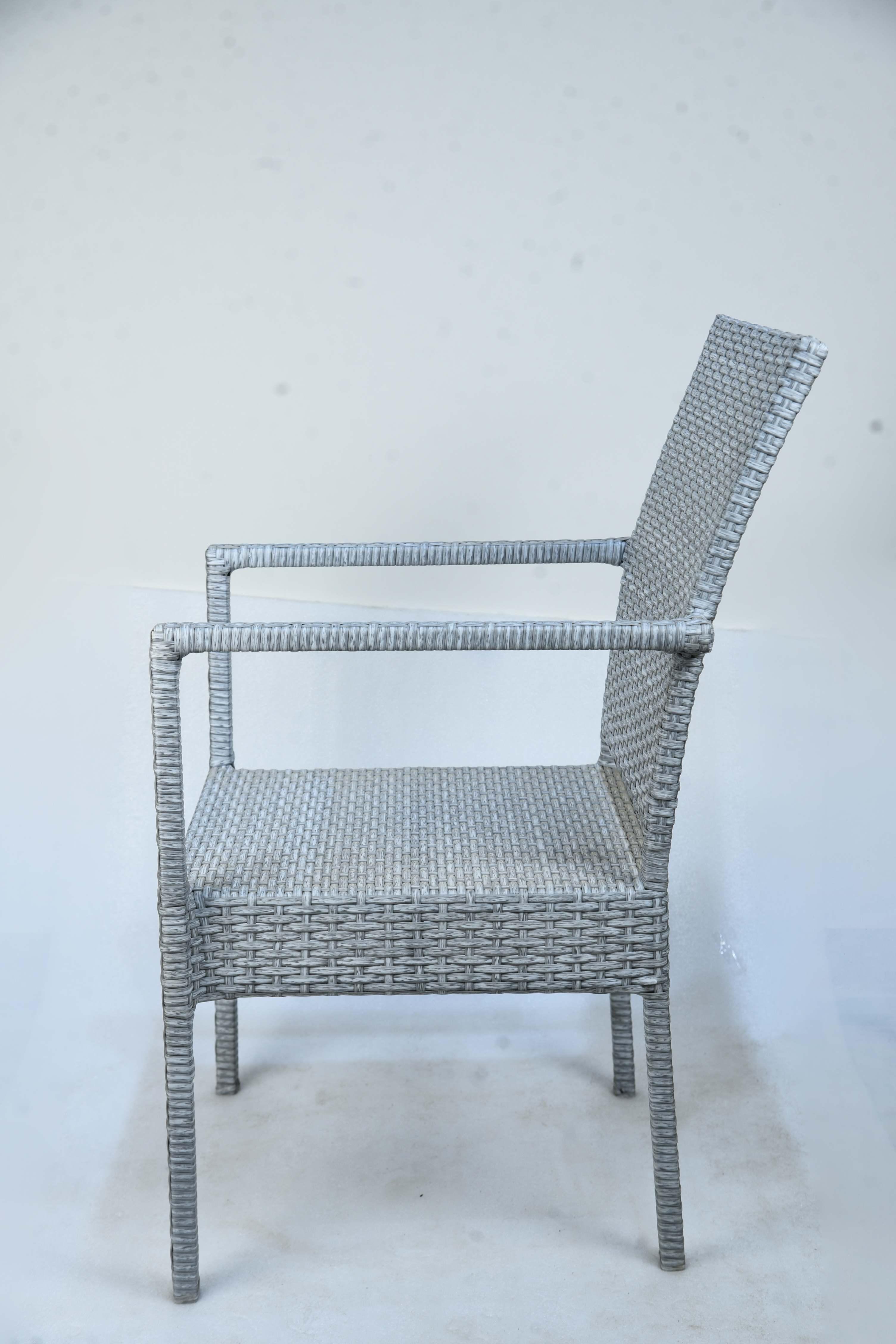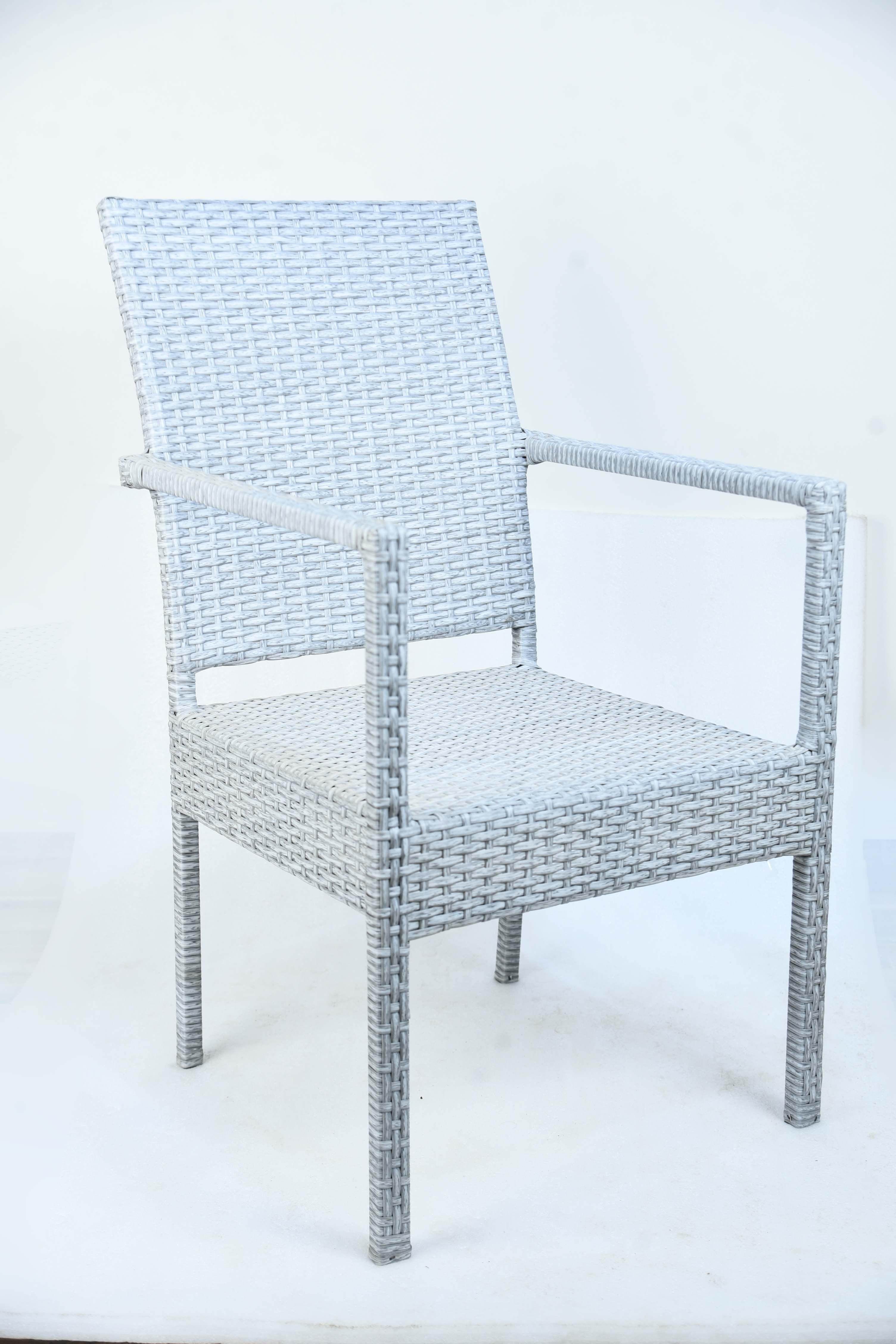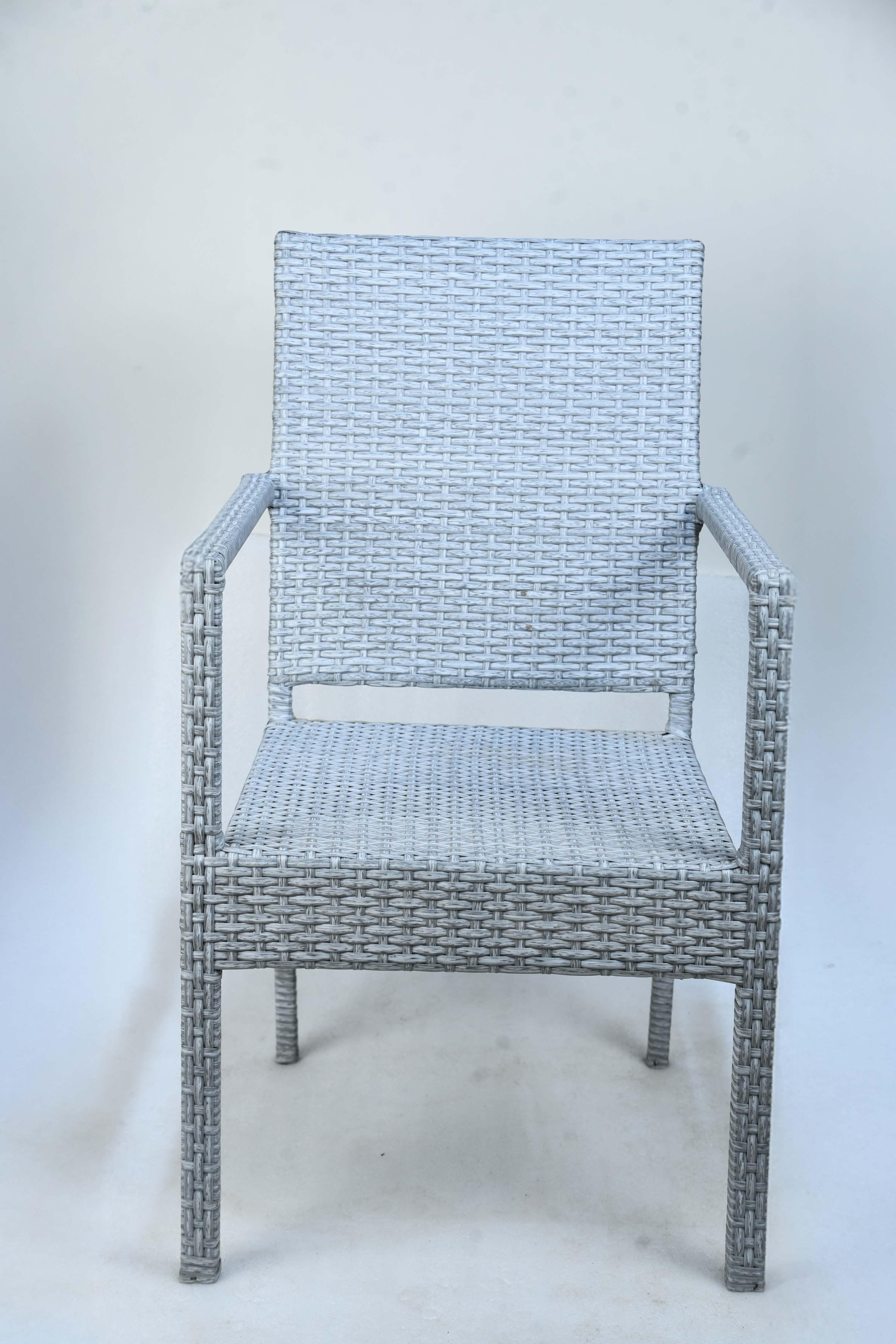 A stylish outdoor chair with a modern design, crafted entirely from weather-resistant white synthetic rattan, ideal for relaxing outdoors. Available in all colors.
